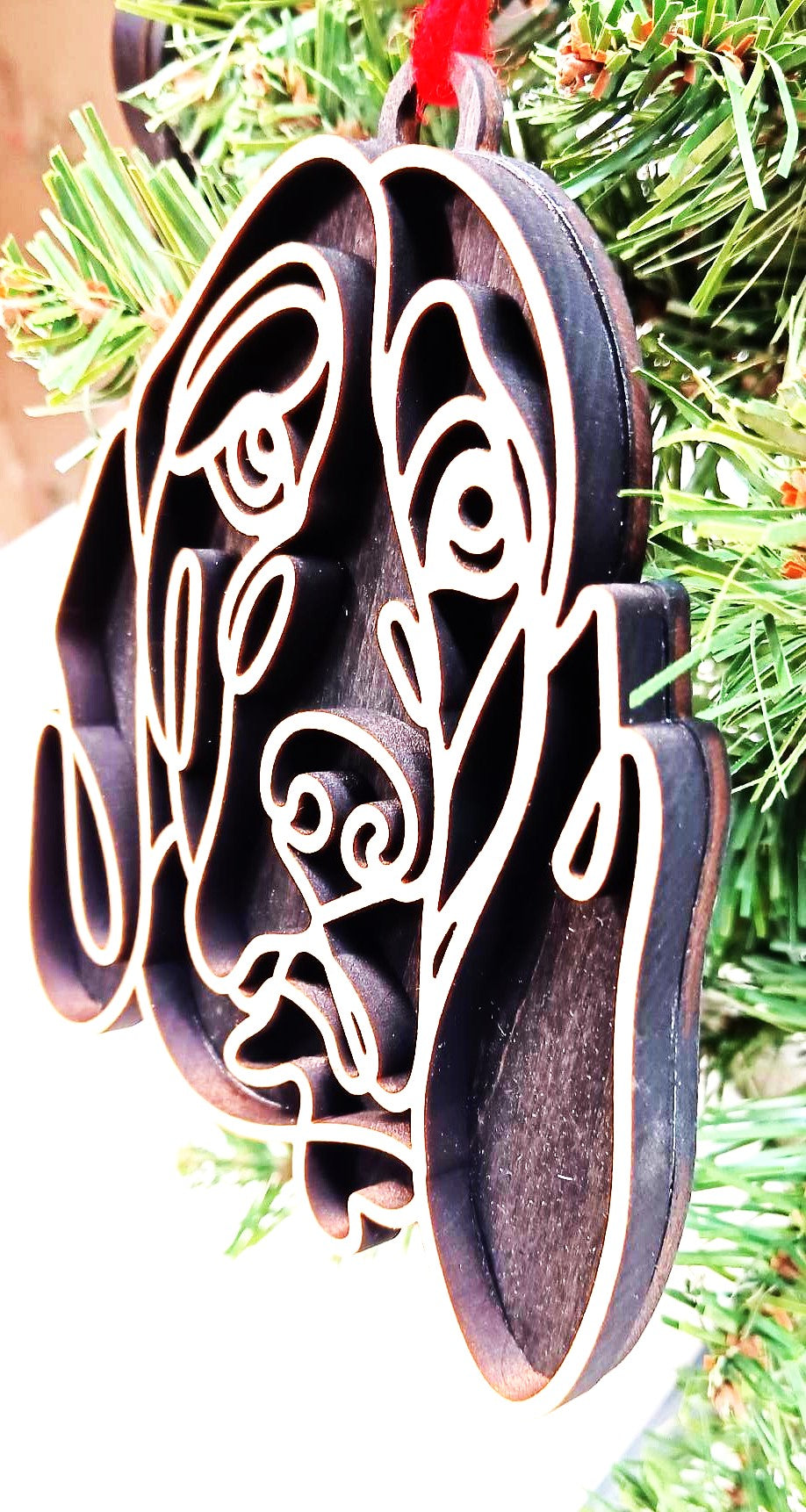 This wooden ornament is two layers of premium woods. The back layer has a unique Aged Barrel stain. The top layer is made from hard maple and it has a polyacrylic coating.