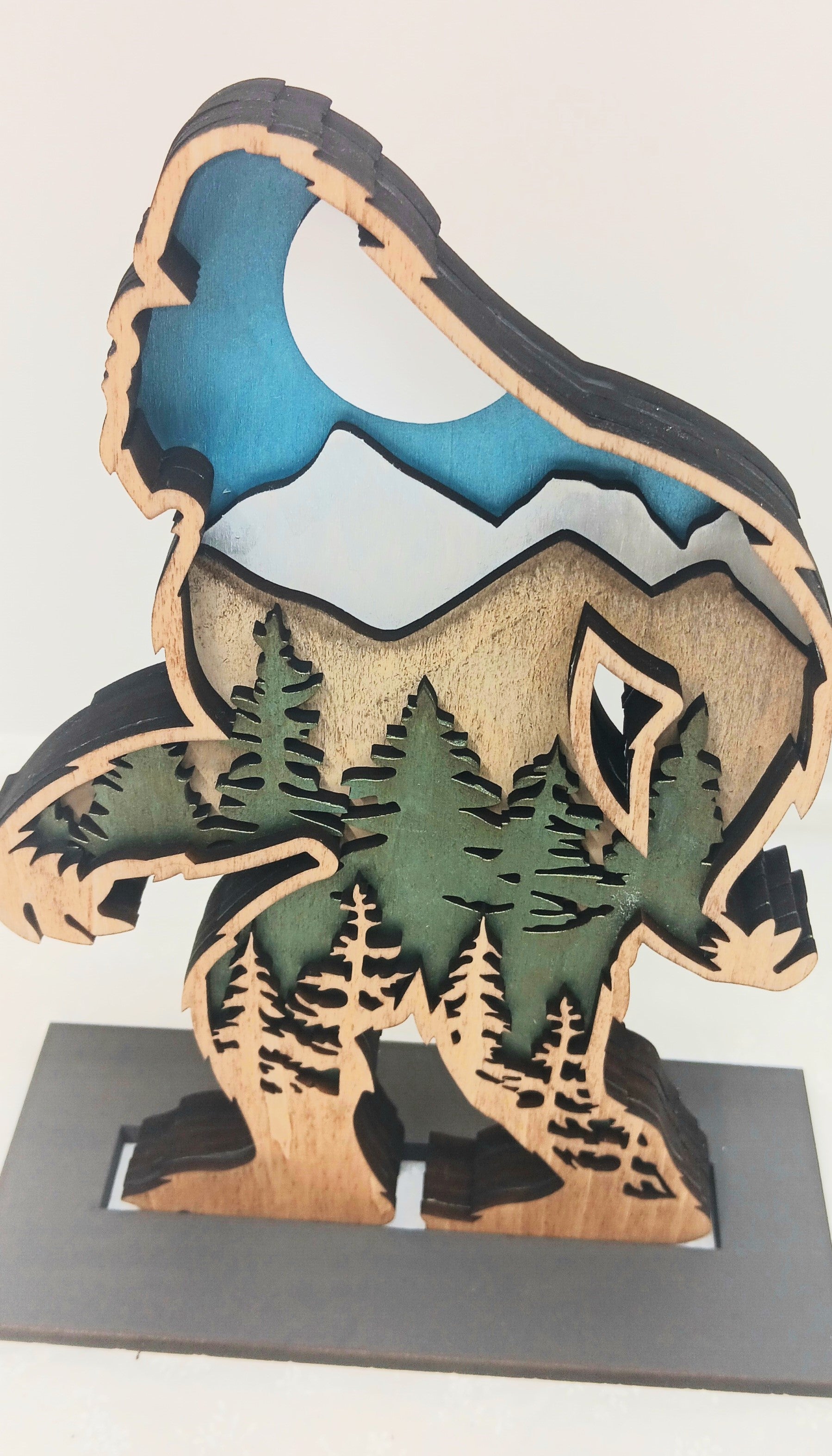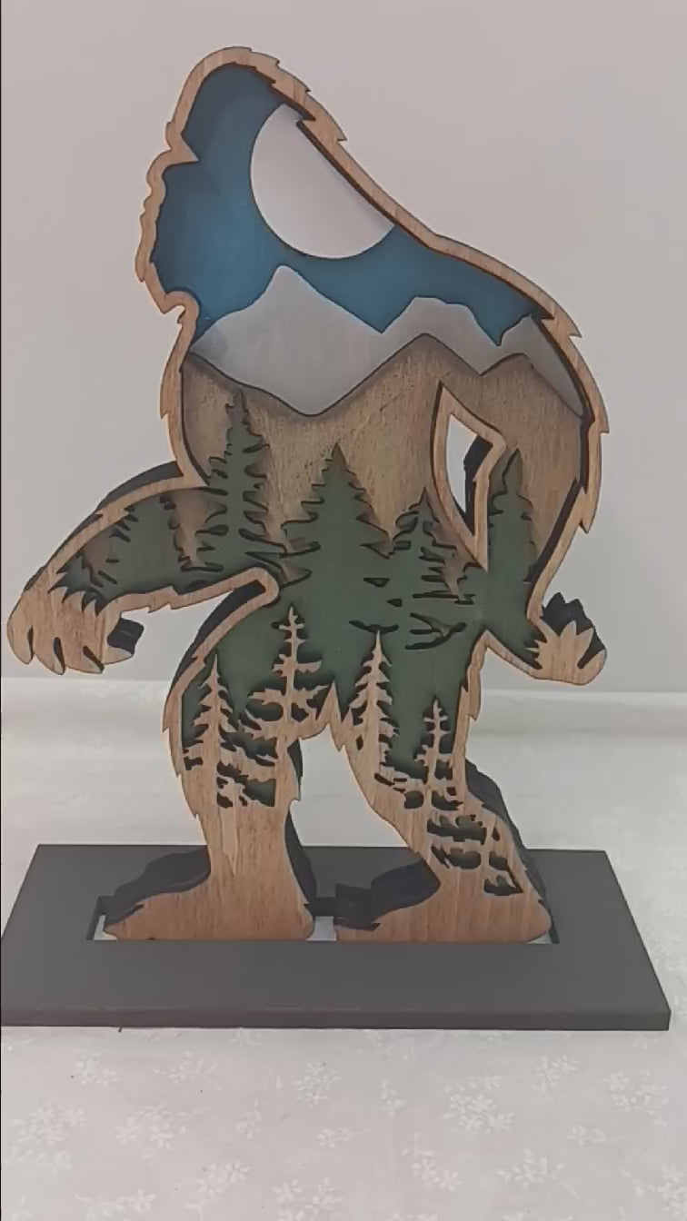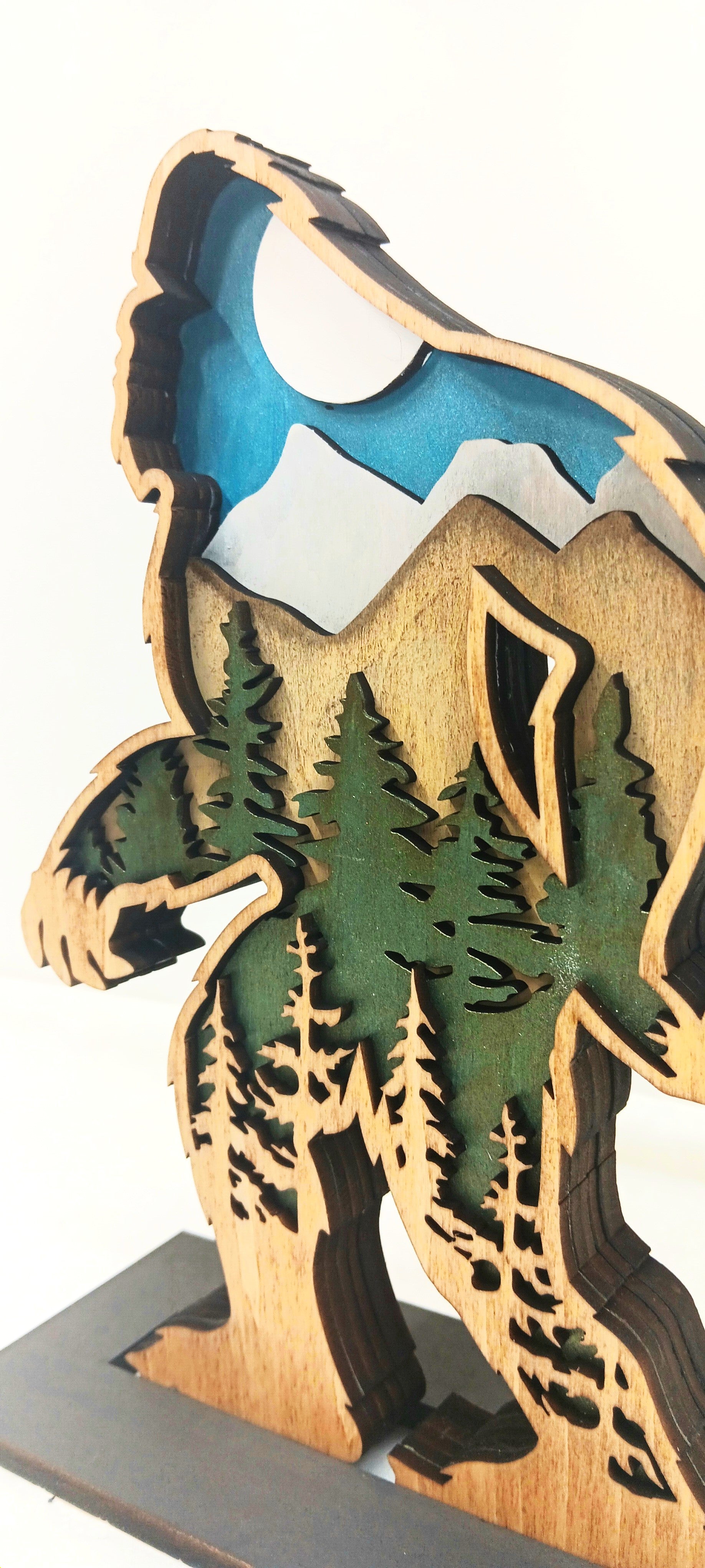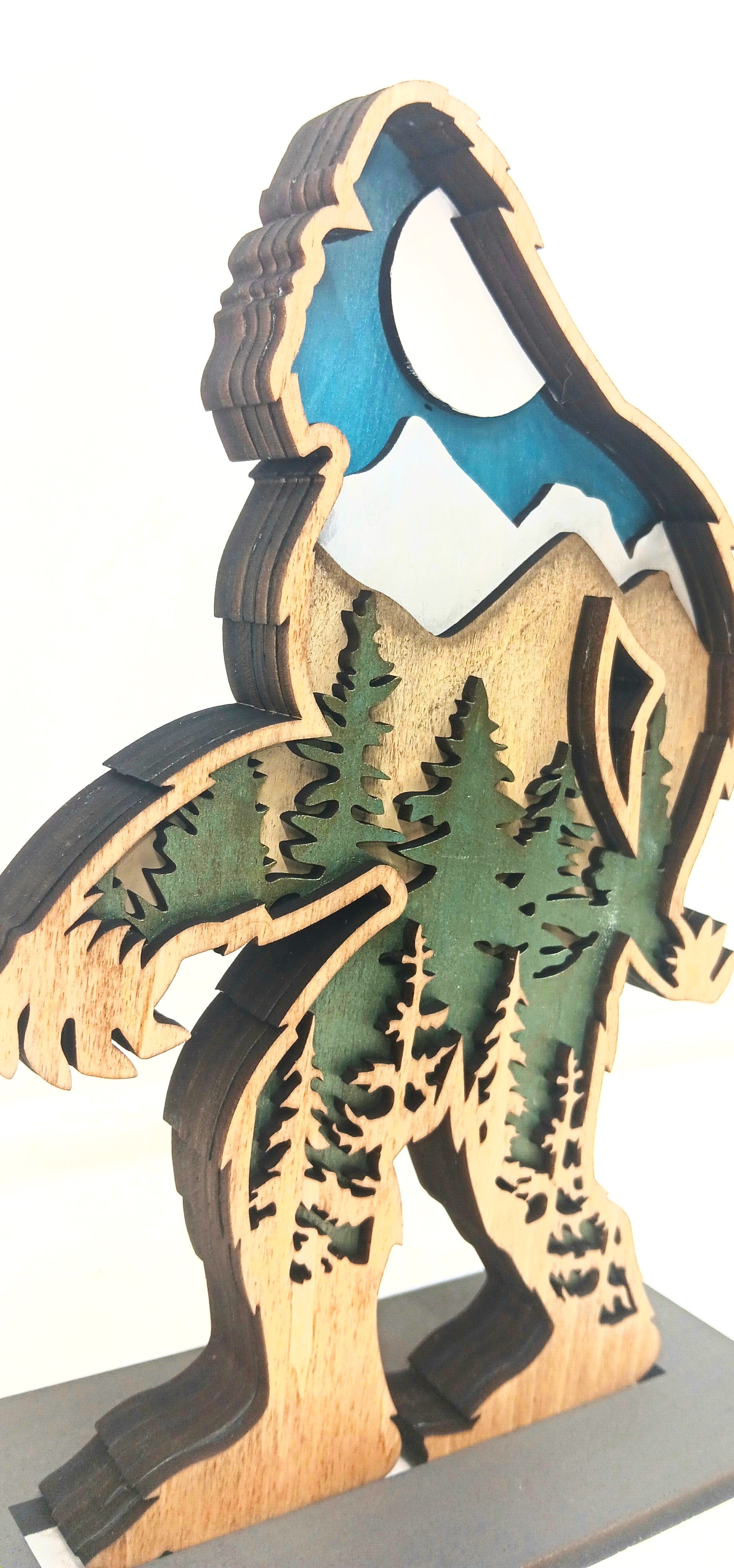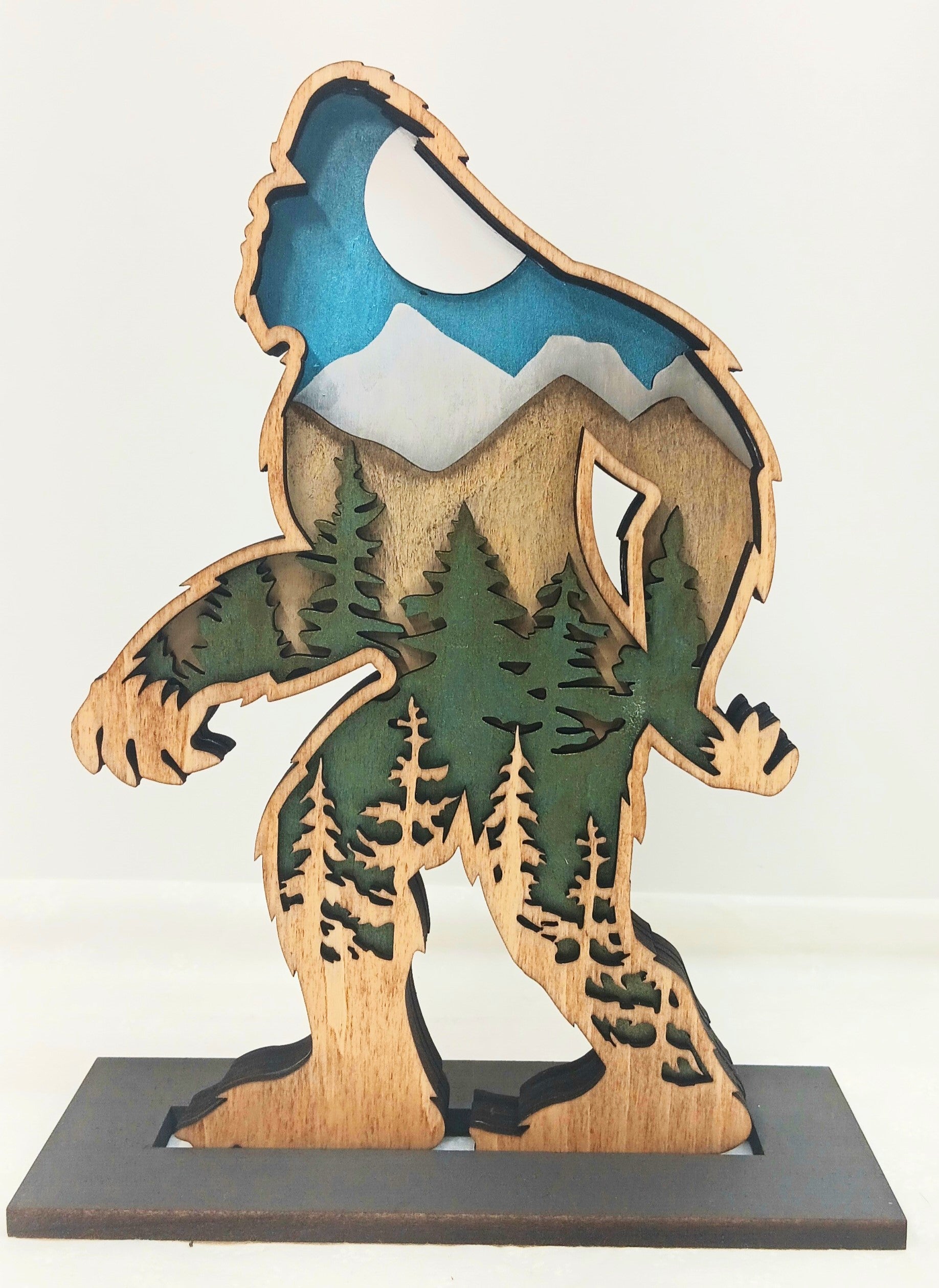 Add some quirky charm to your living space with our Big Foot - Sasquatch Shelf Sitter Decor. Crafted from high-quality wood, this piece features an intricate laser-cut design with five different layers that bring a touch of wilderness into your home.
