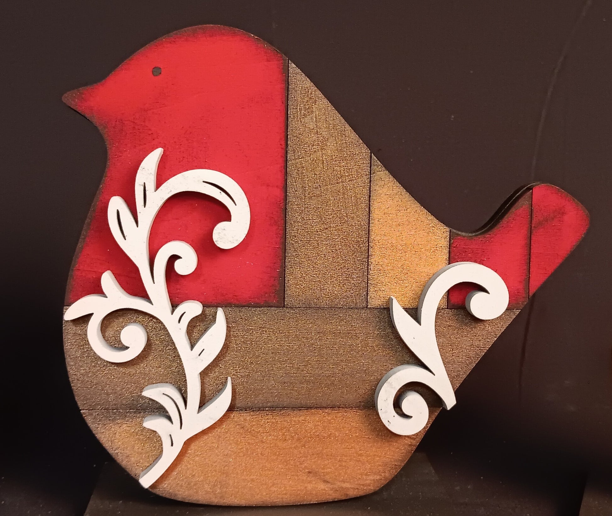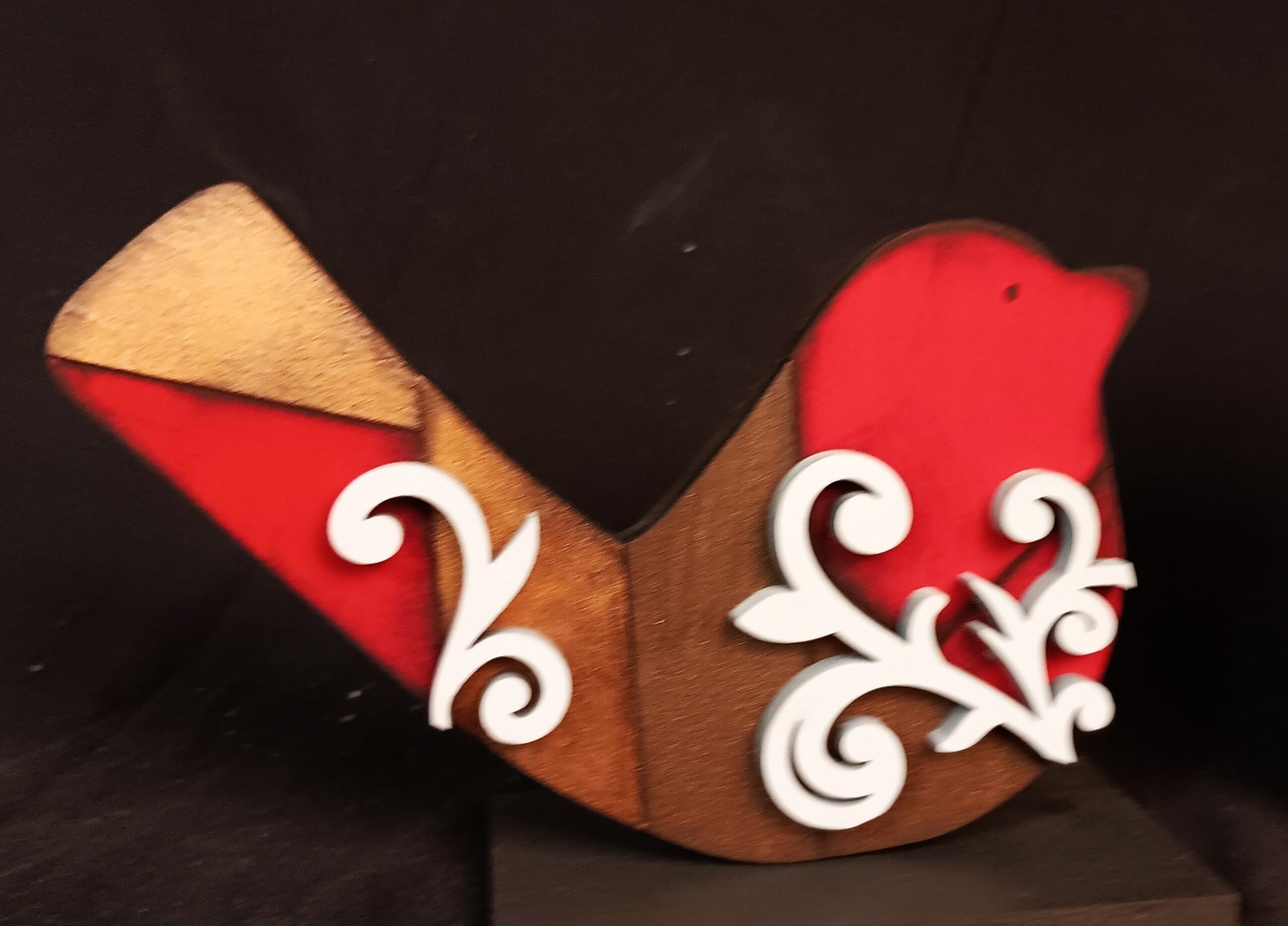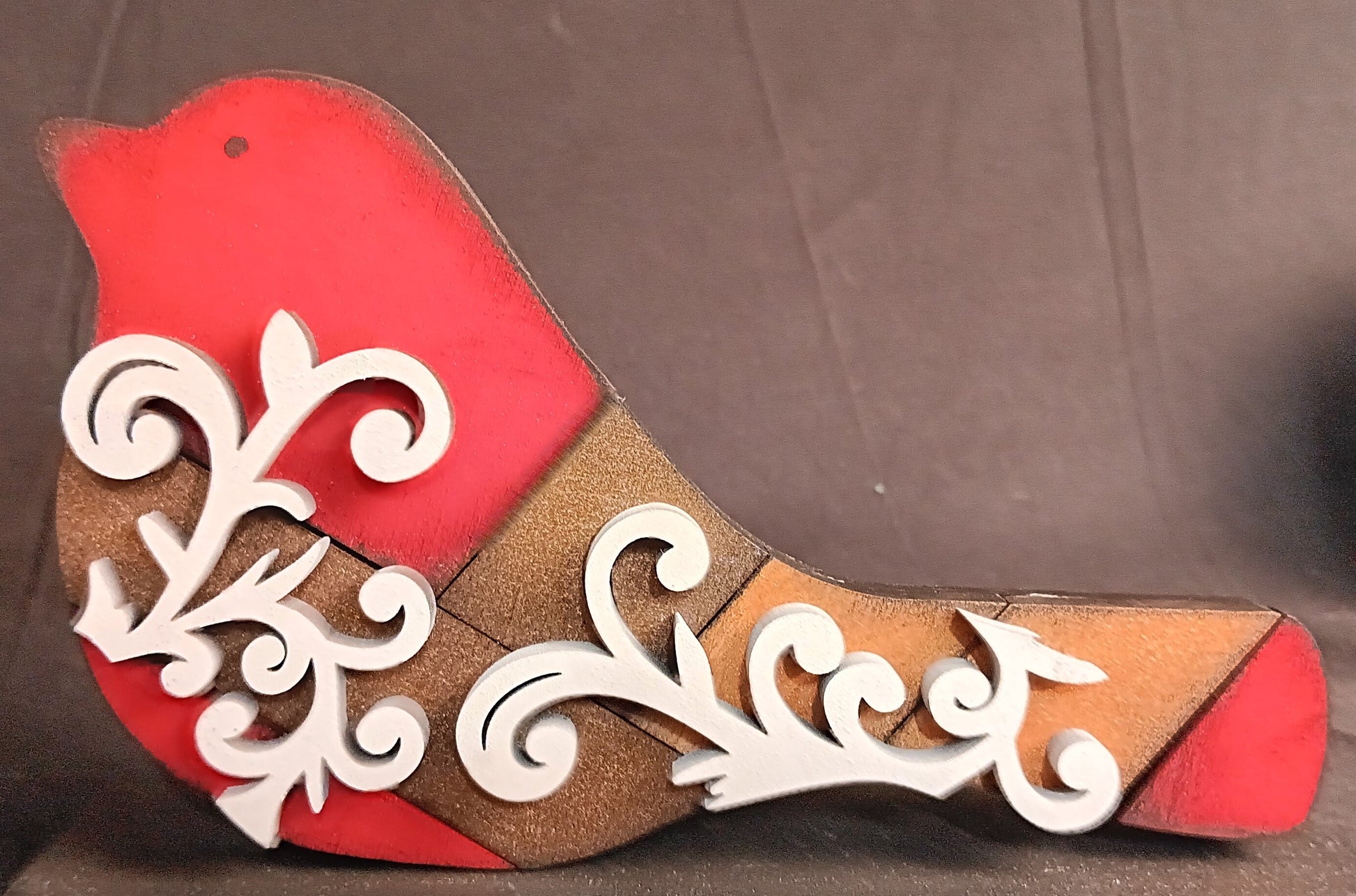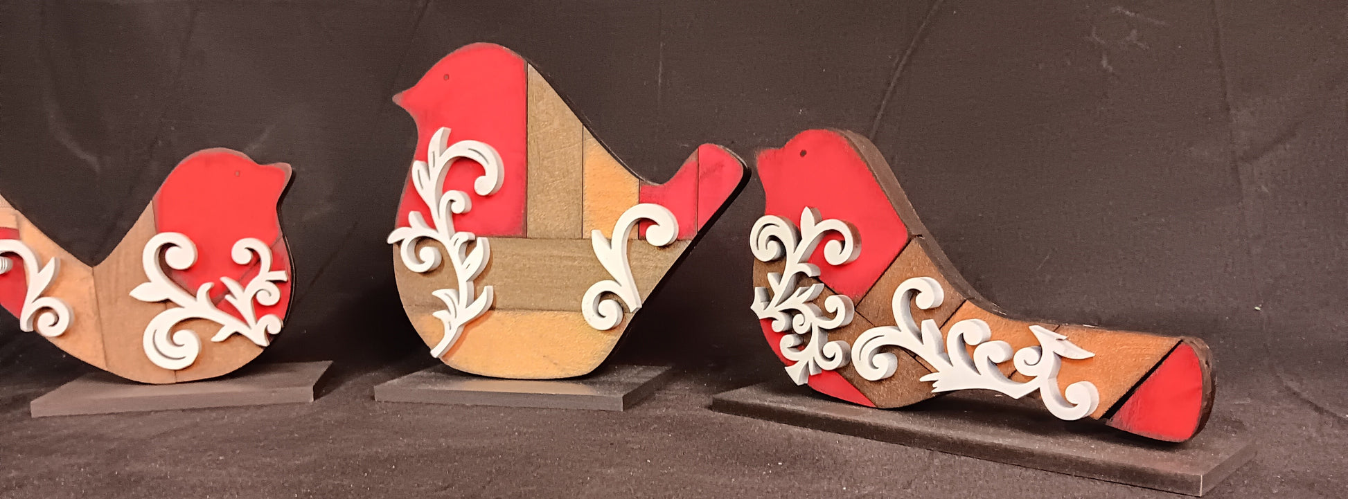 I paint each birdie using three different metallic and iridescent (color shifting) paints. These beauties are red, espresso, and bronze in color. Their flourishes are a bright white.