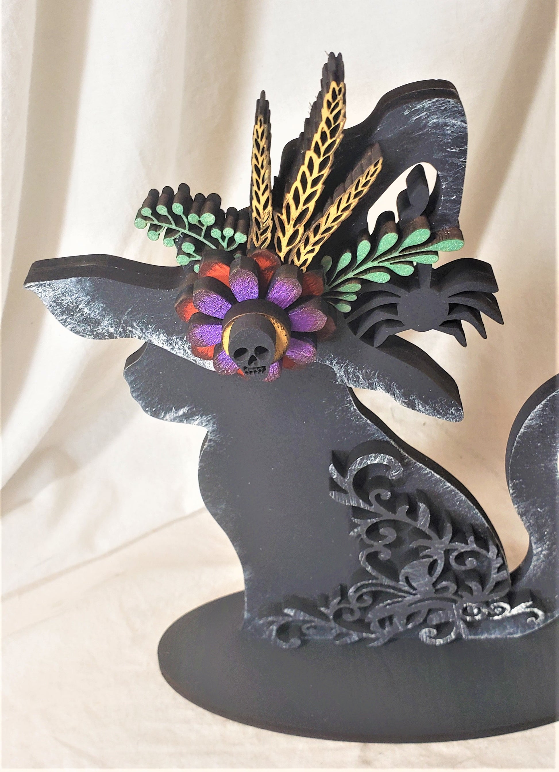 I use Acrylic, Chalk, and Mica paints to bring out all of the characteristics of this awesome kitty! Lastly he gets a layer of polyacrylic to protect him.