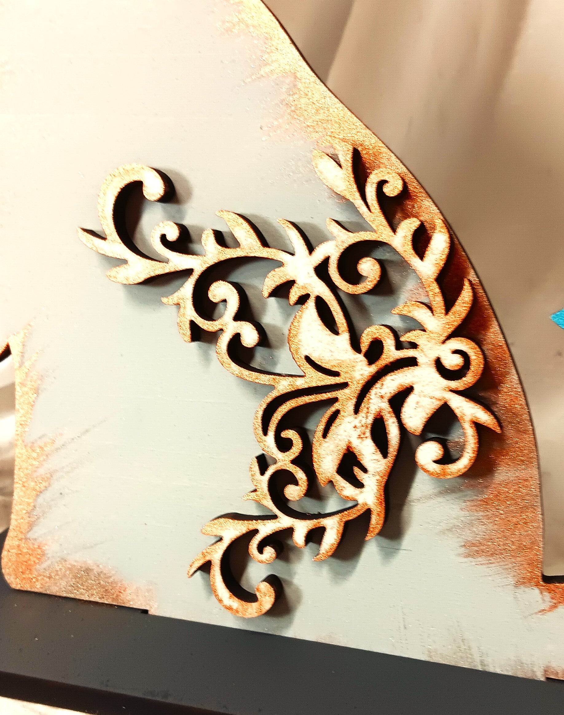 She has beautiful Country Grey hair with red and brown highlights!! She has a decorative flourish which is dry brushed with brown & red Mica paints as well.