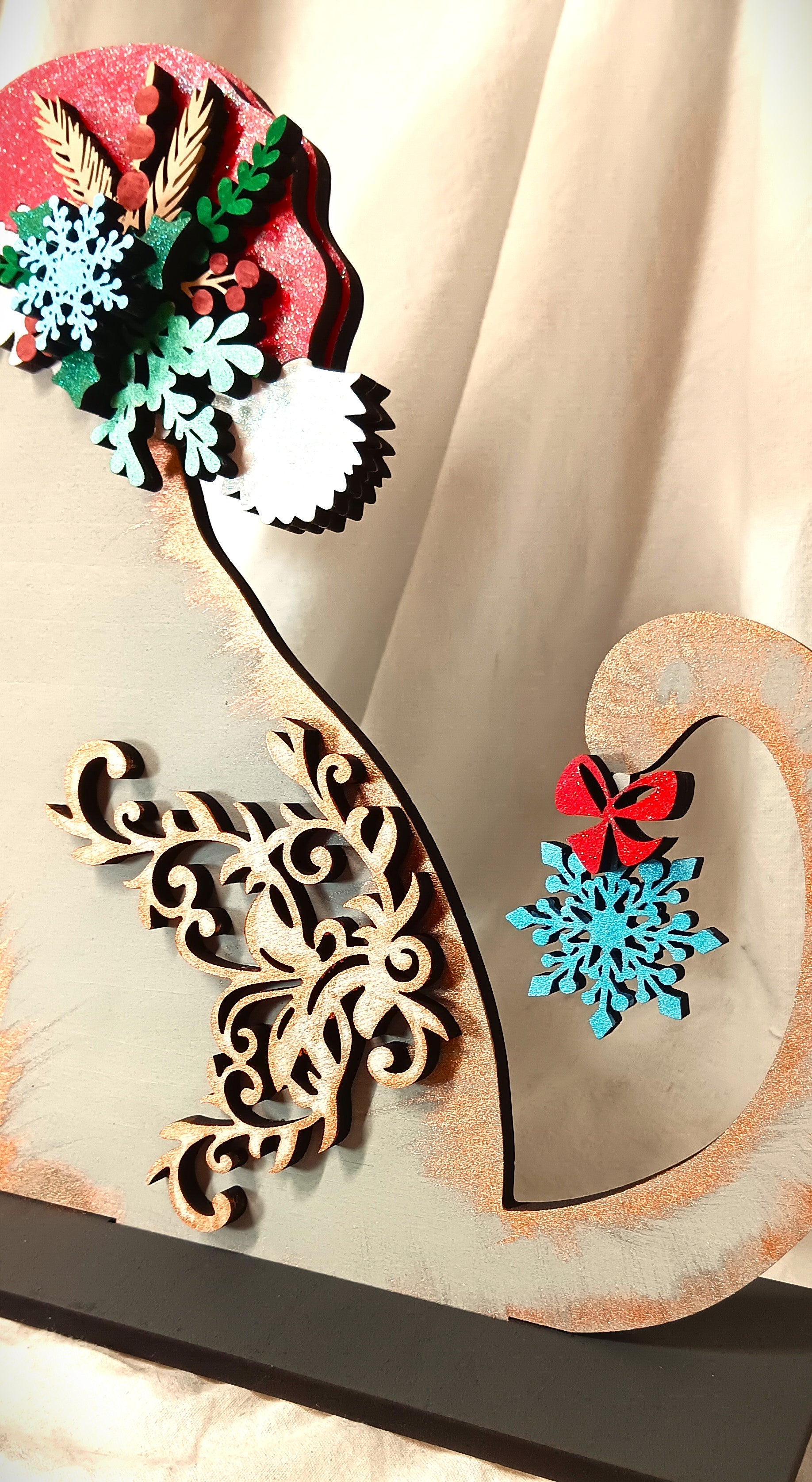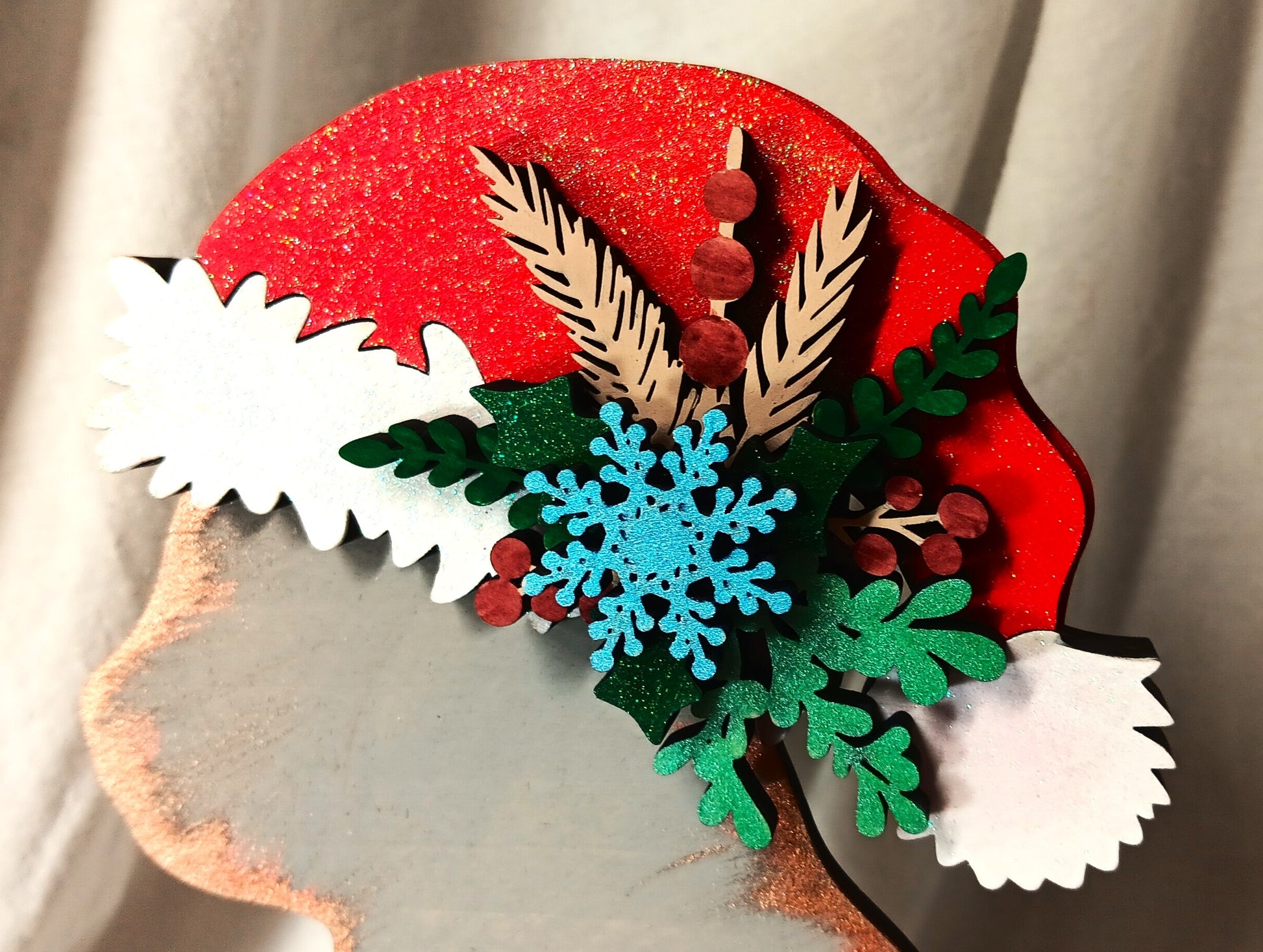 Her Santa hat is decked out with glitter and adorned with a poinsettia and snowflake!