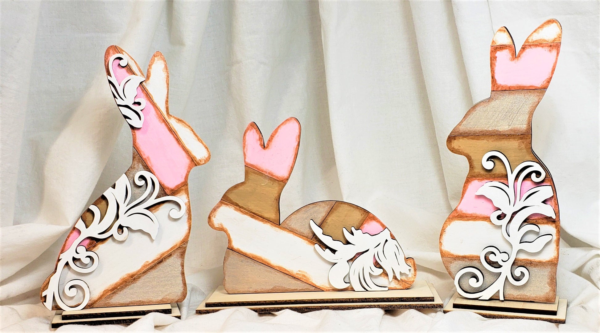 The left bunny measures 6.5X4 inches, the center bunny measures 5X5 inches, and the right bunny is 7X3 inches.