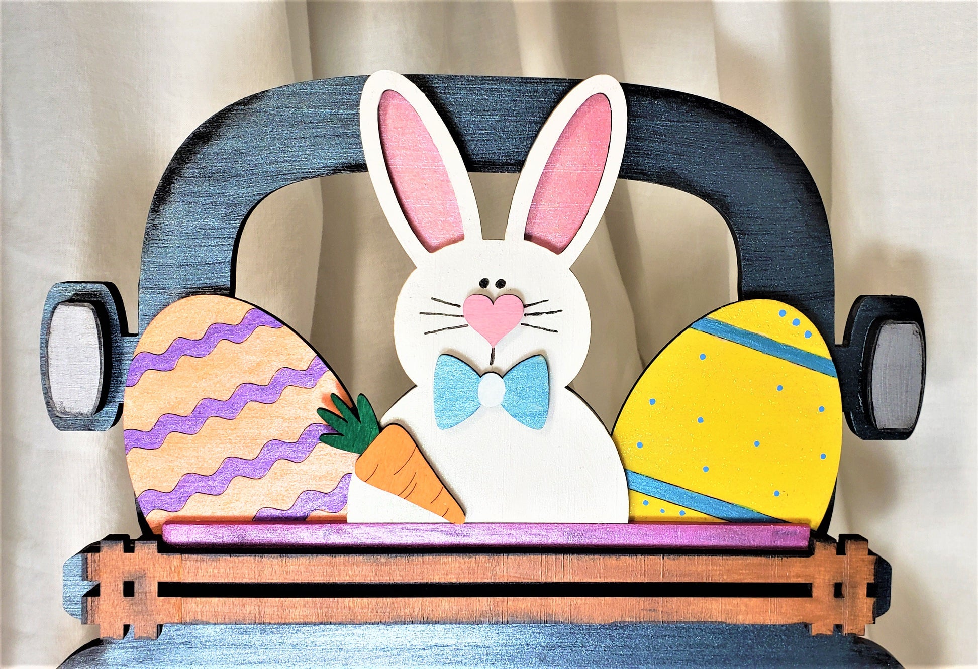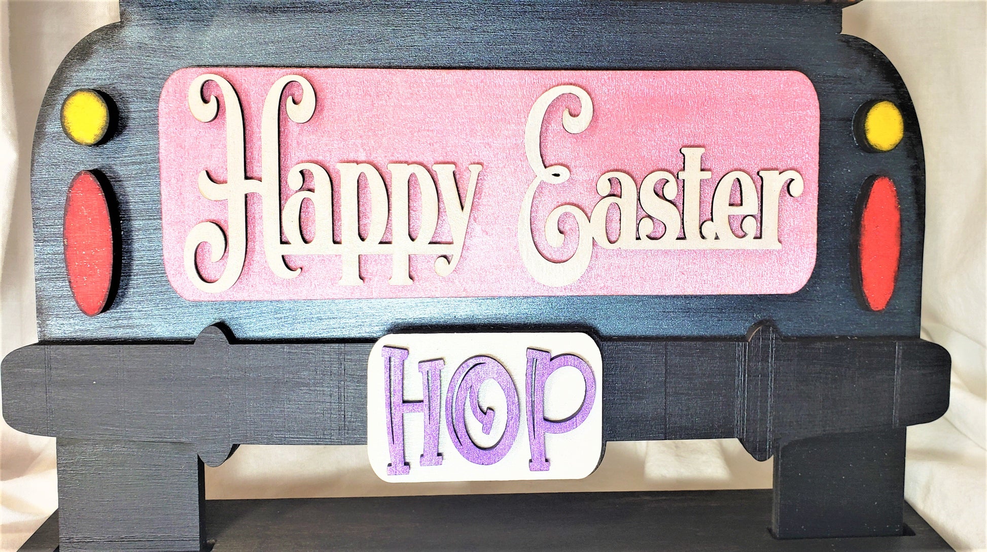 When you bring home this adorable truck, it will be decked out with an adorable bunny and his favorite Easter eggs in the back window! It also has a tailgate sign that says, "Happy Easter" in glitter white, and his personalized license plate that says "Hop" !