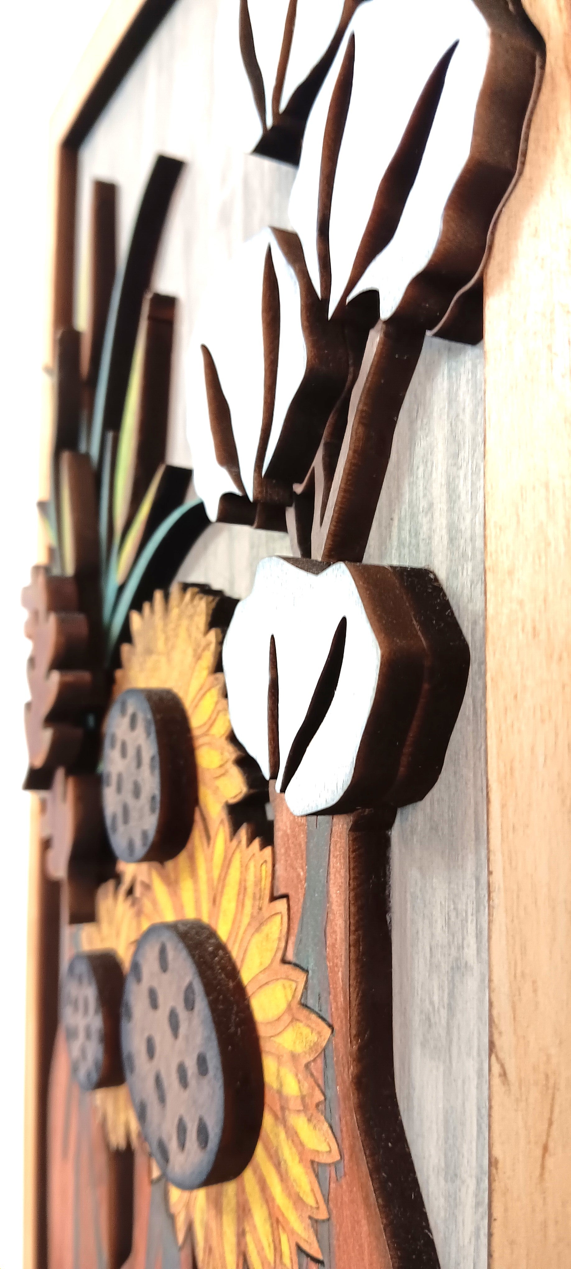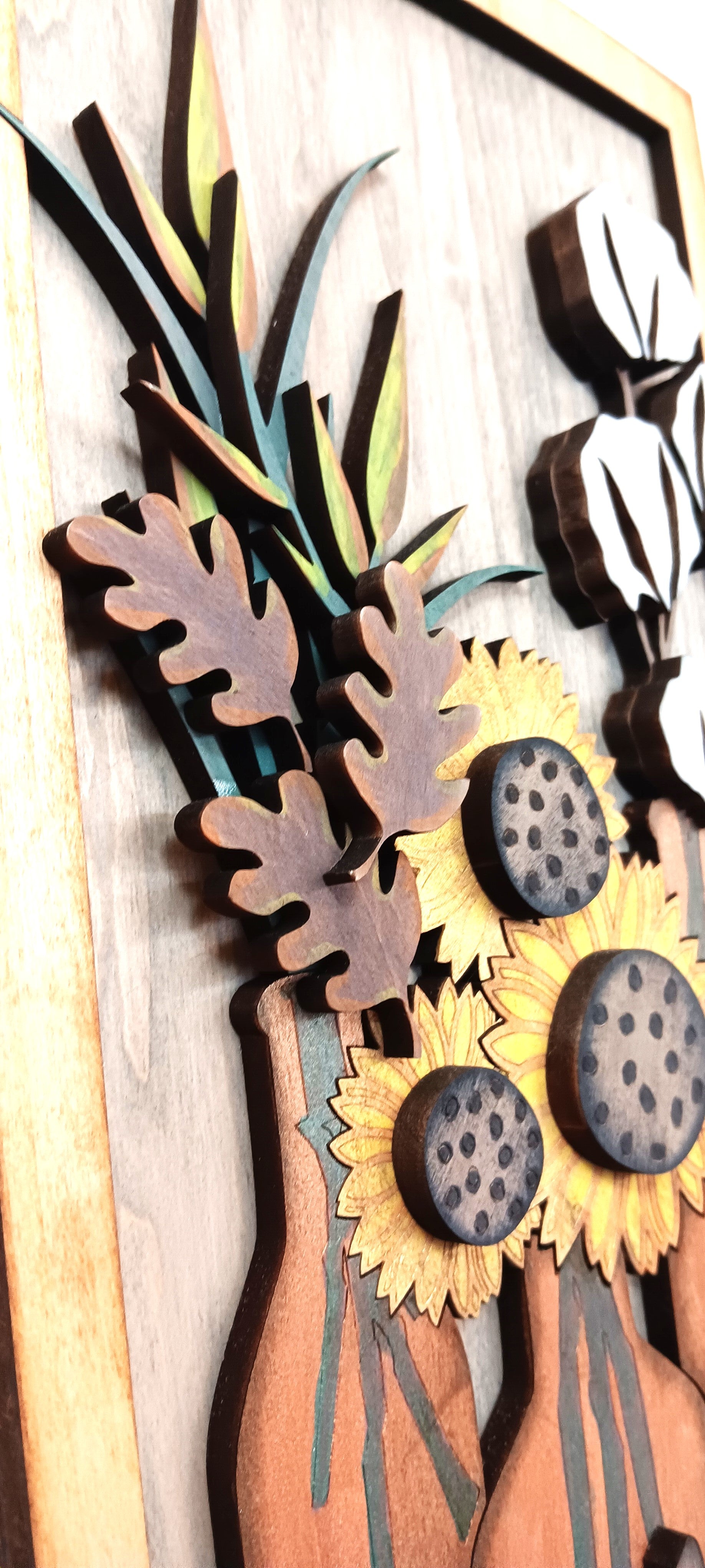 This beautiful fall picture includes three bottles holding fall grasses, cotton, and of course sunflowers!