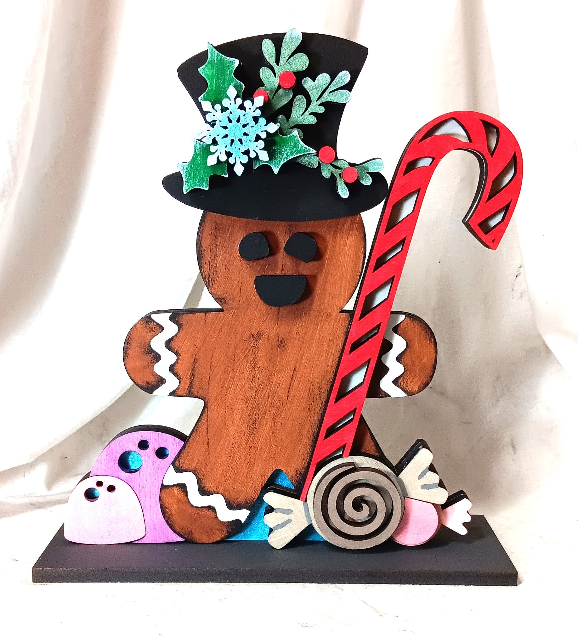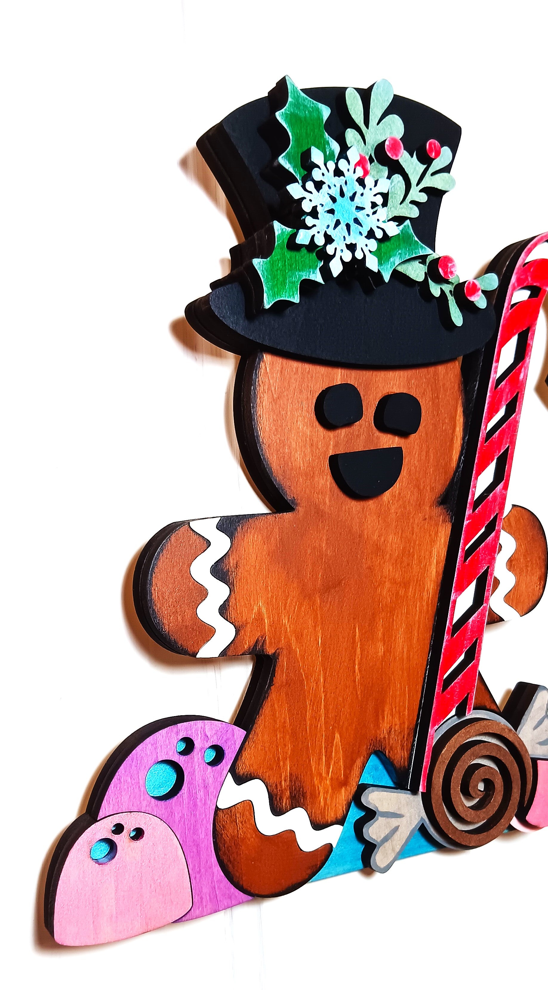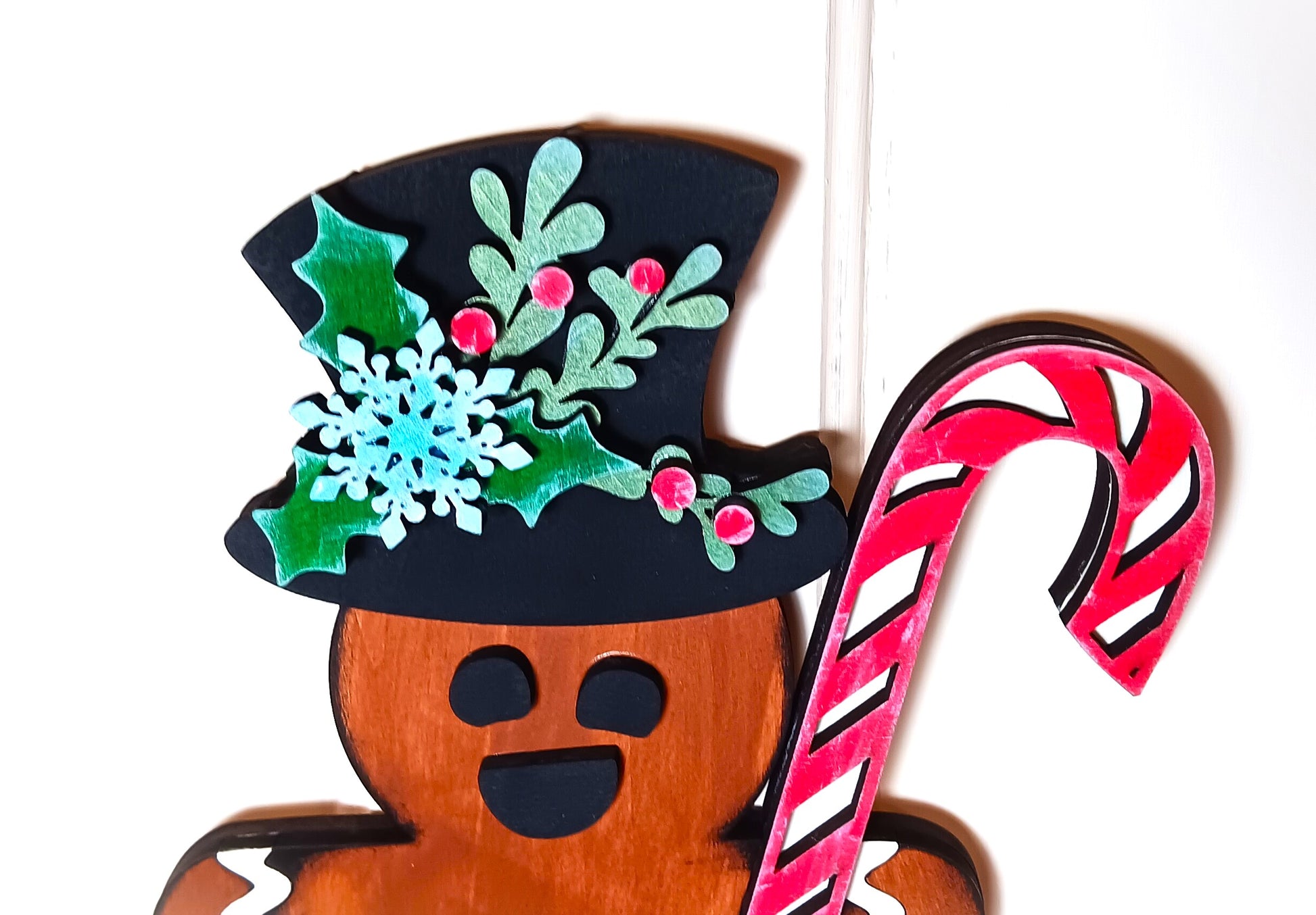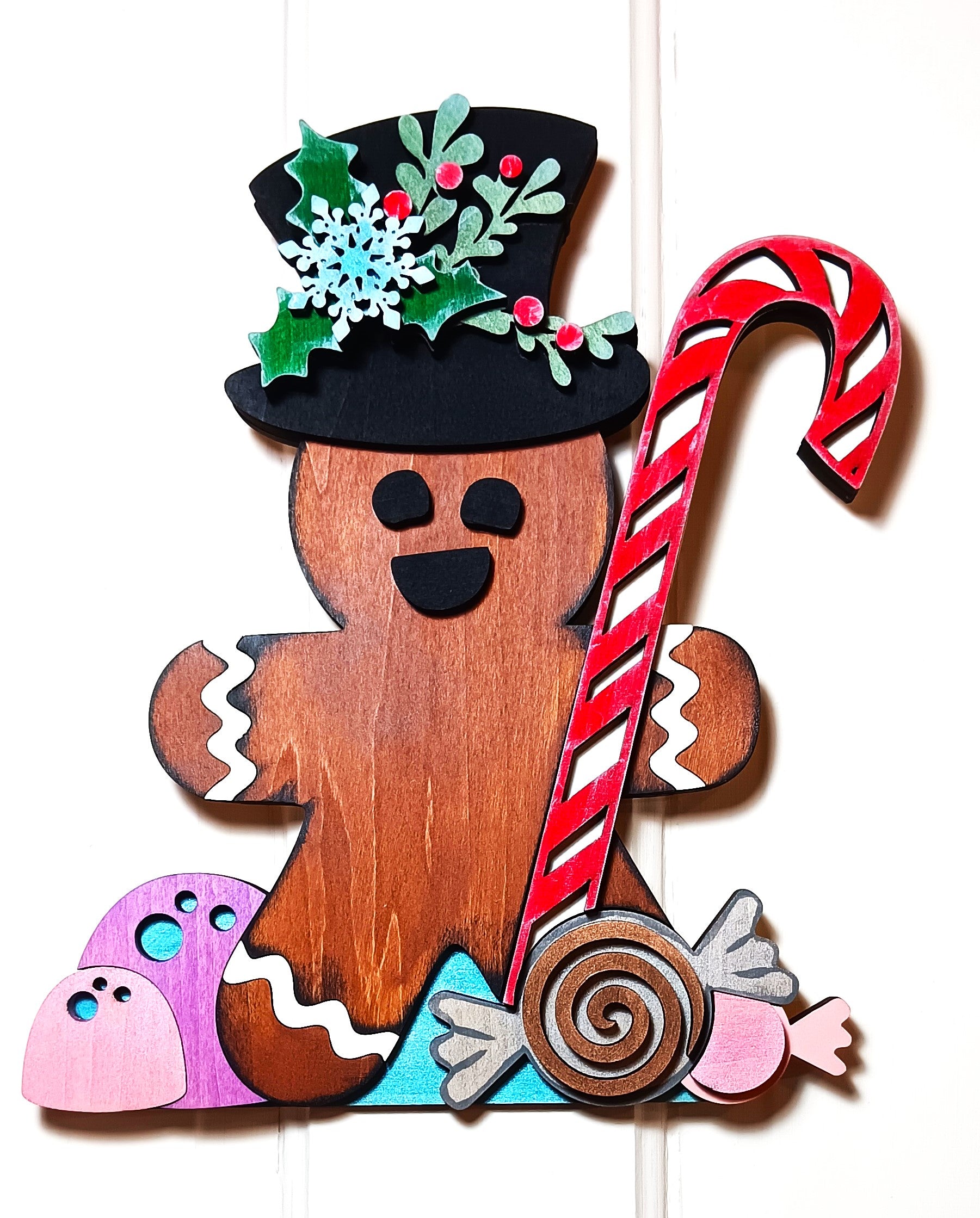 I laser cut each piece and hand paint each one as well using various acrylic paints. He also gets a nice coating of Spar urethane to help protect him should you choose to use him as a door hanger.