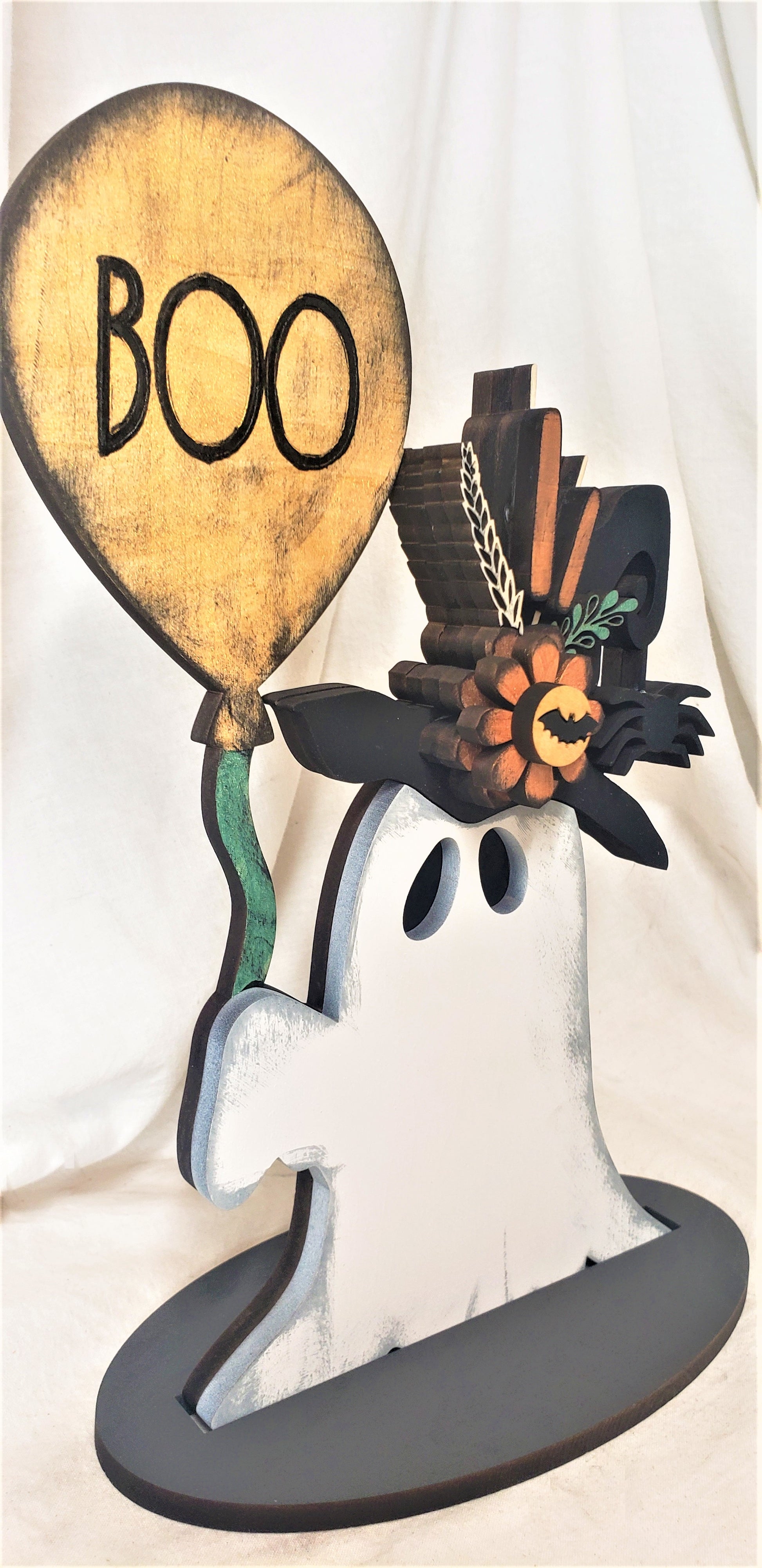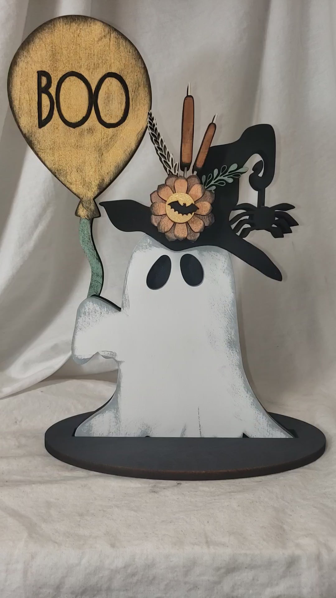 This adorable Halloween Ghost is 11 inches tall and he is 7 inches wide. He also comes with his own stand.