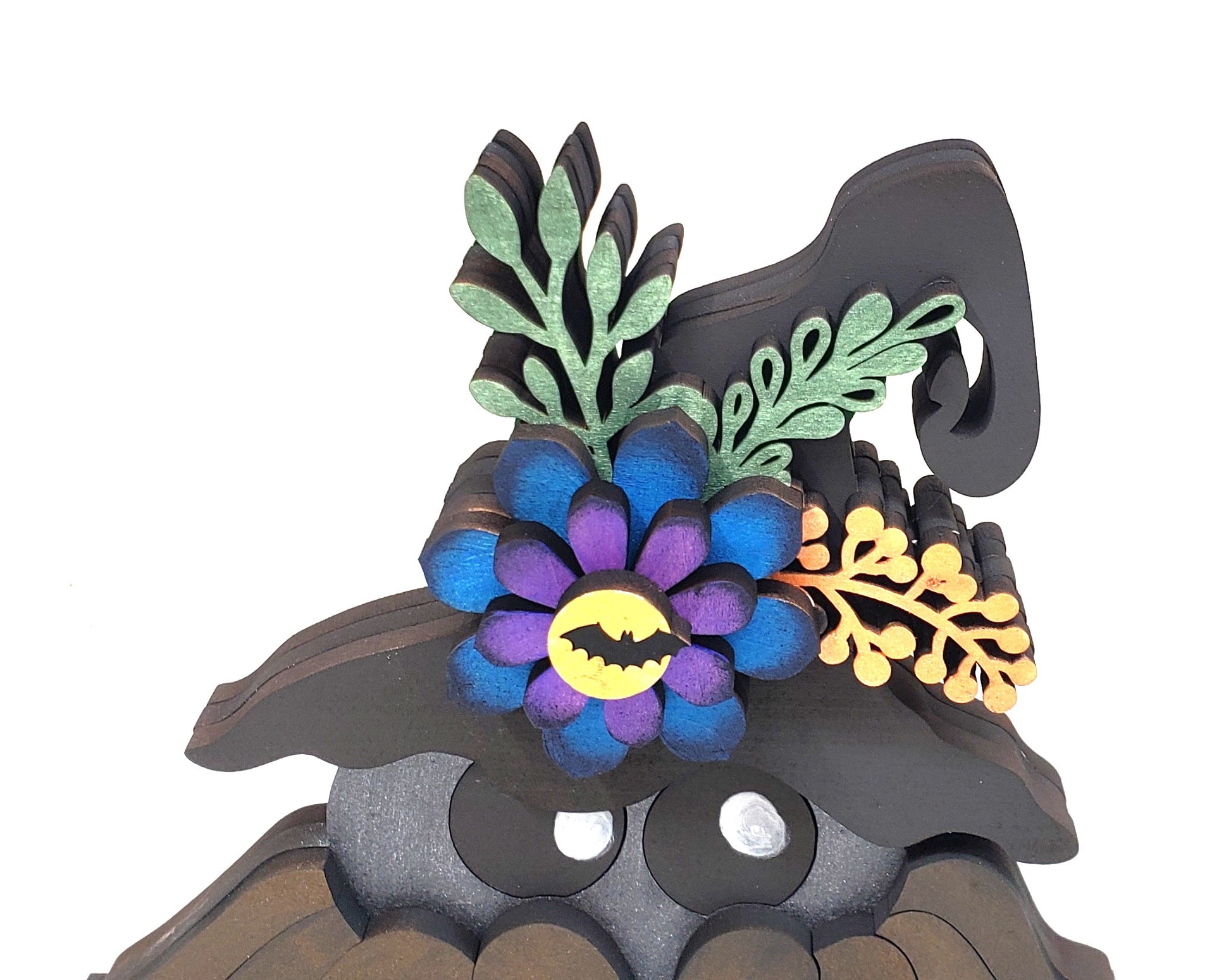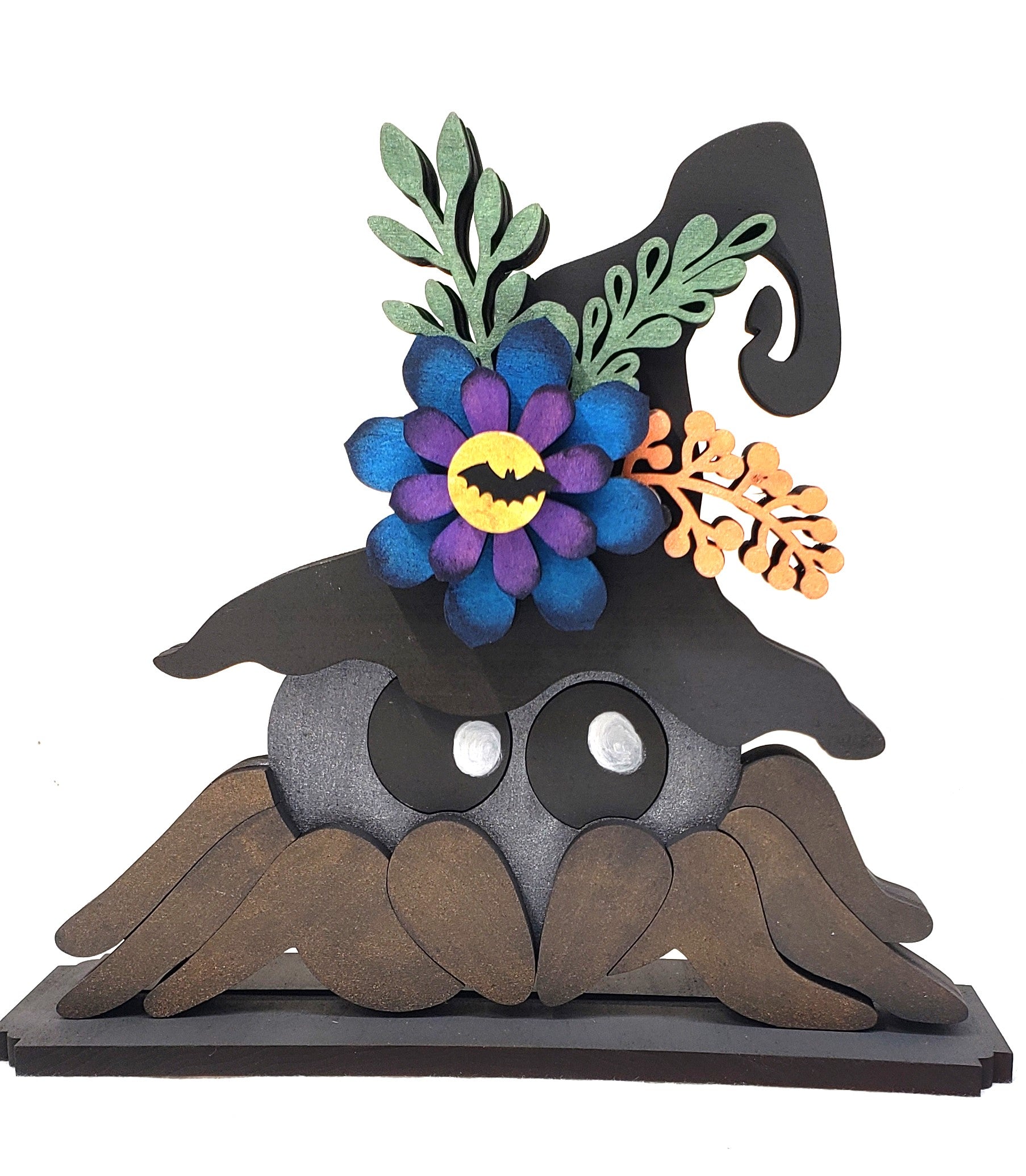 The spider is adorned with a large, floppy witch's hat decorated with colorful, prominent flowers. The flower has vibrant blue and purple petals, a bright yellow center featuring a bat silhouette, and green and orange leaf-like accents surrounding it.