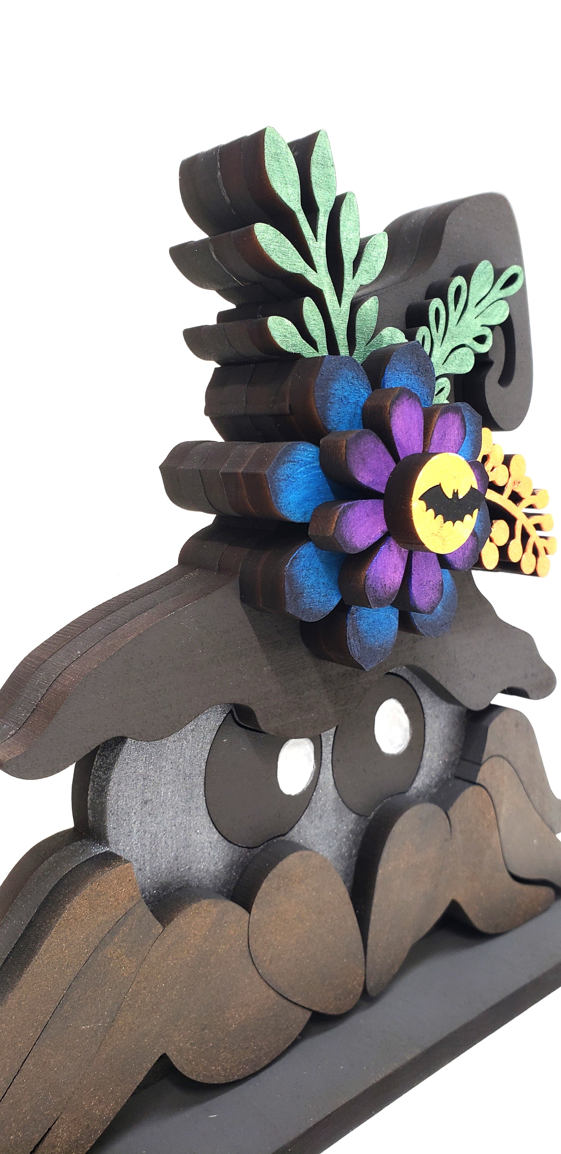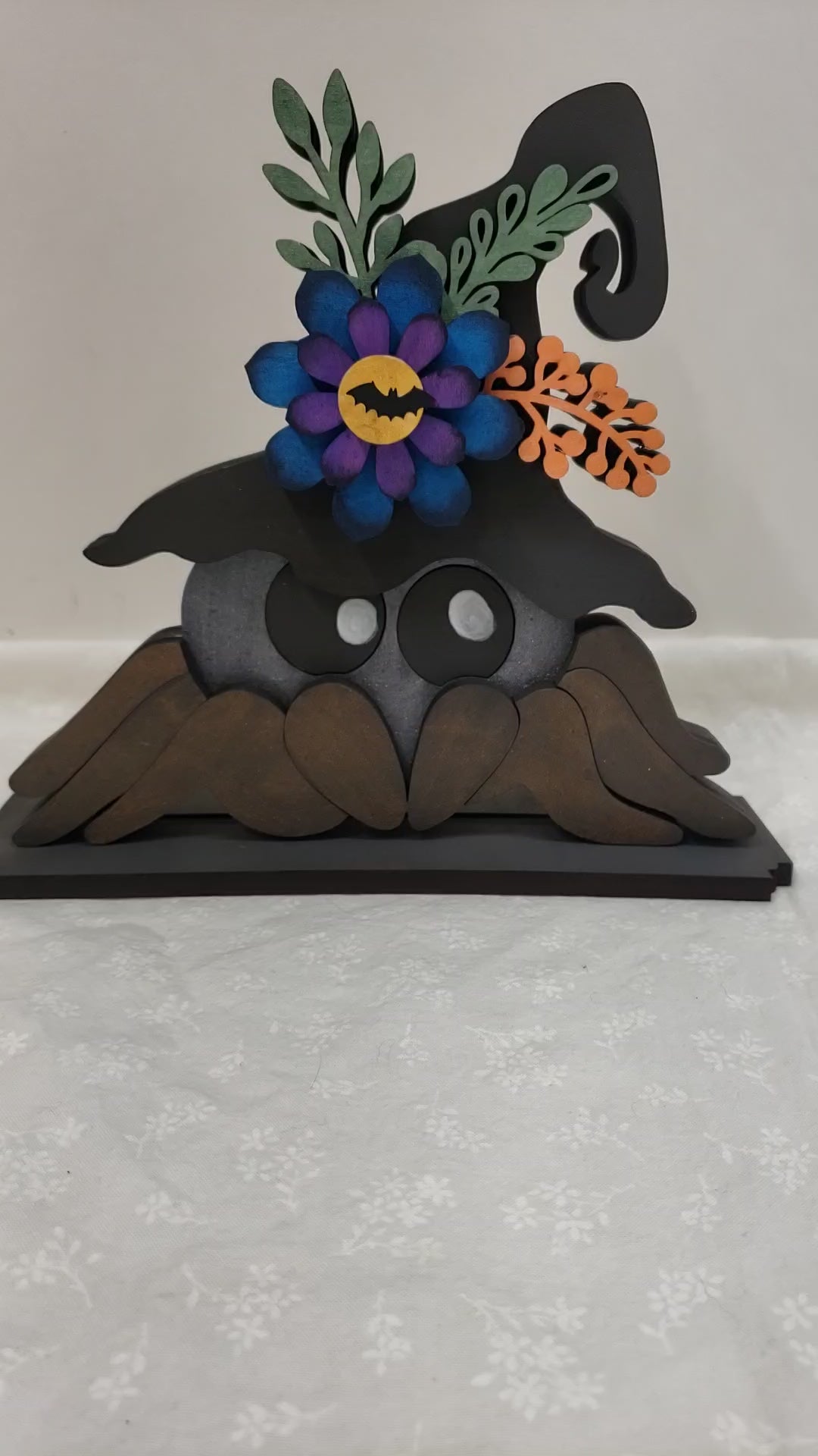 I cut each of his pieces on my laser and then I hand paint each one. His Halloween hat is painted with black chalk paint. His body and legs are dry brushed with Mica paints; his body is a silvery grey and his legs are a chocolate brown.