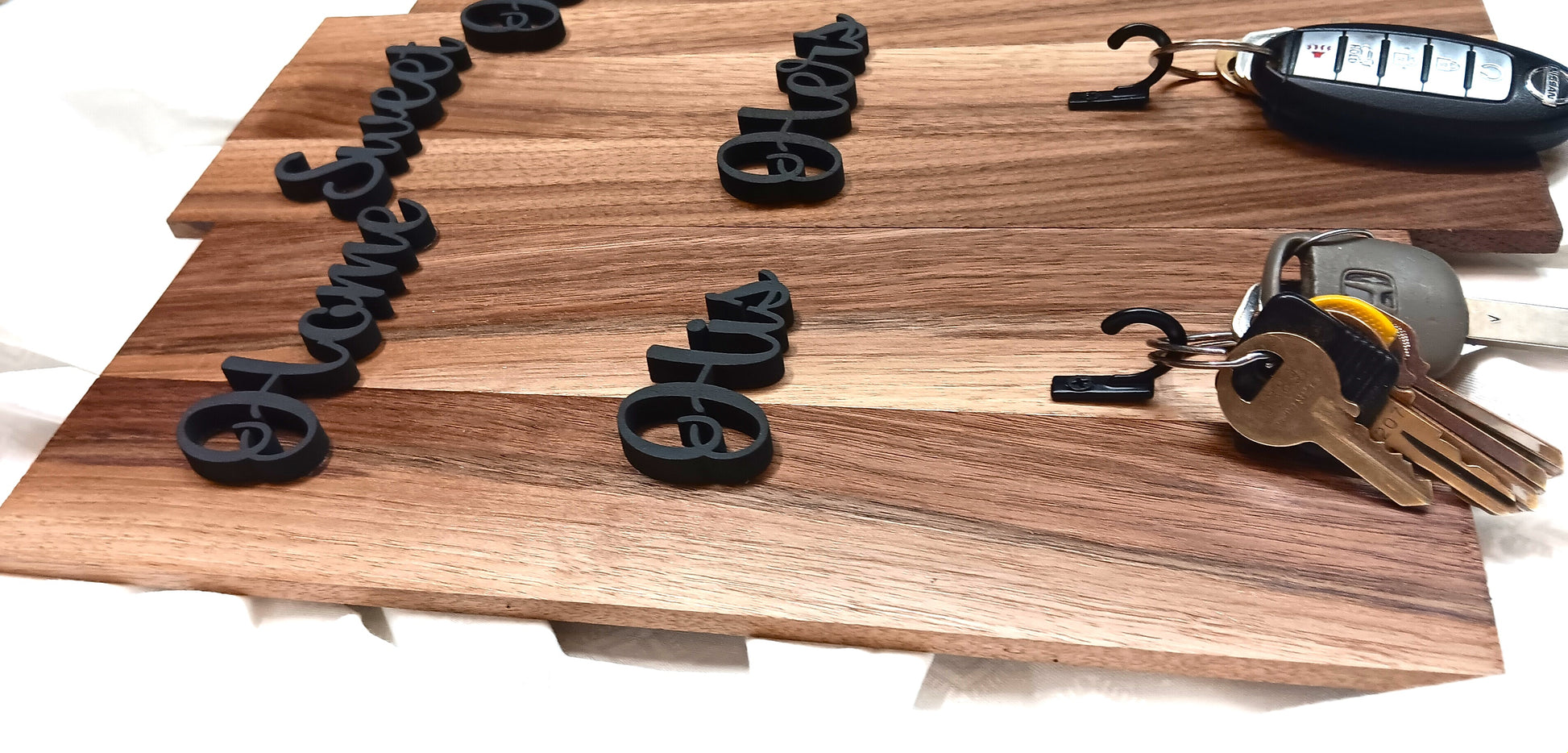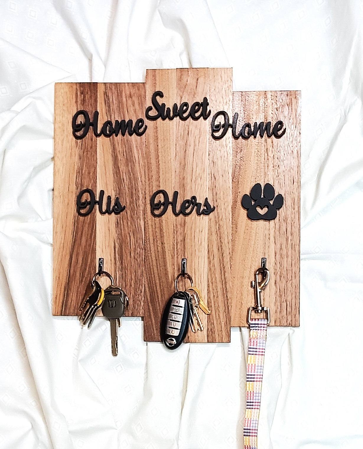 Looking for that perfect gift for the dog lover or new homeowner? Here it is! This breathtaking His, Hers, & Dog Key Holder plaque is made from quarter inch Walnut and is assembled in shiplap style.