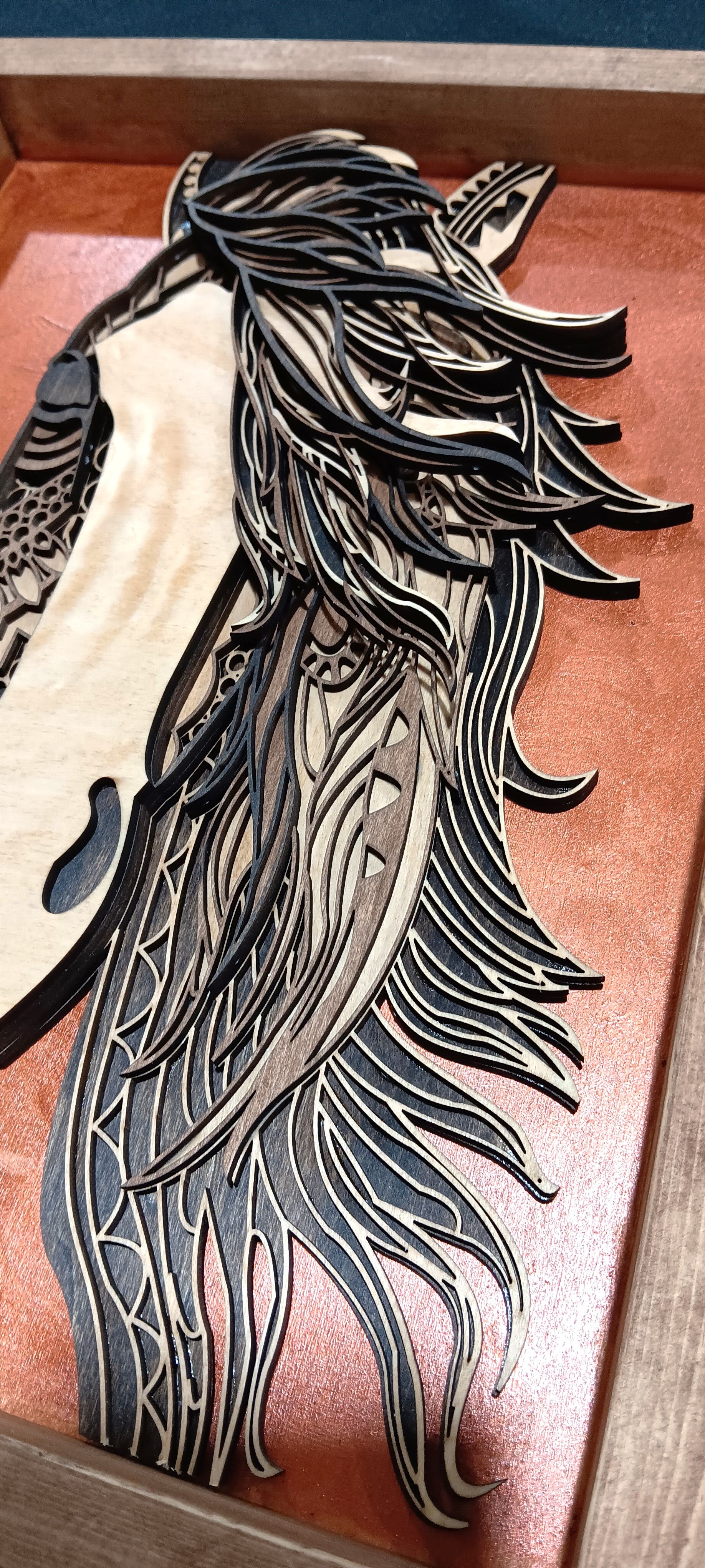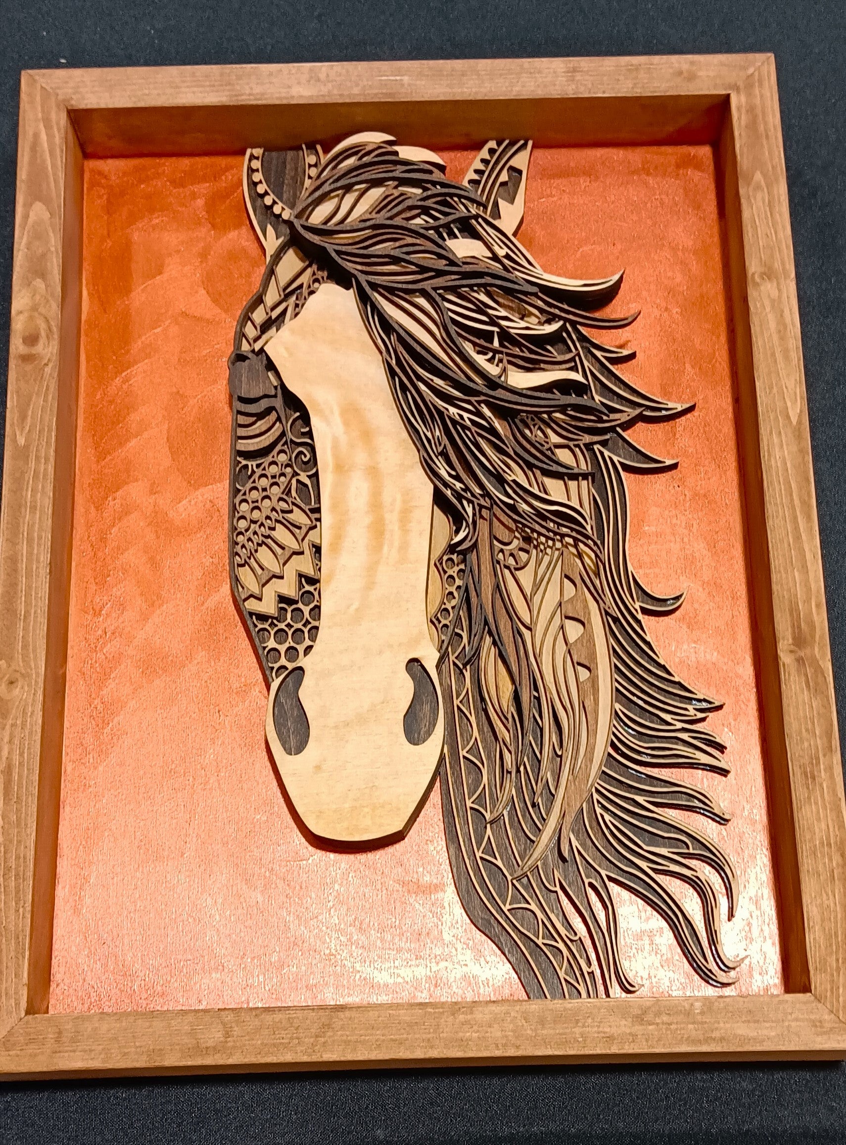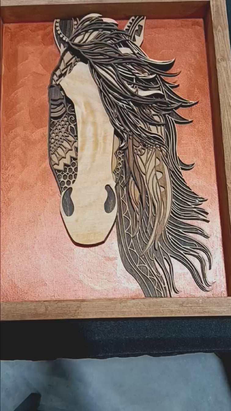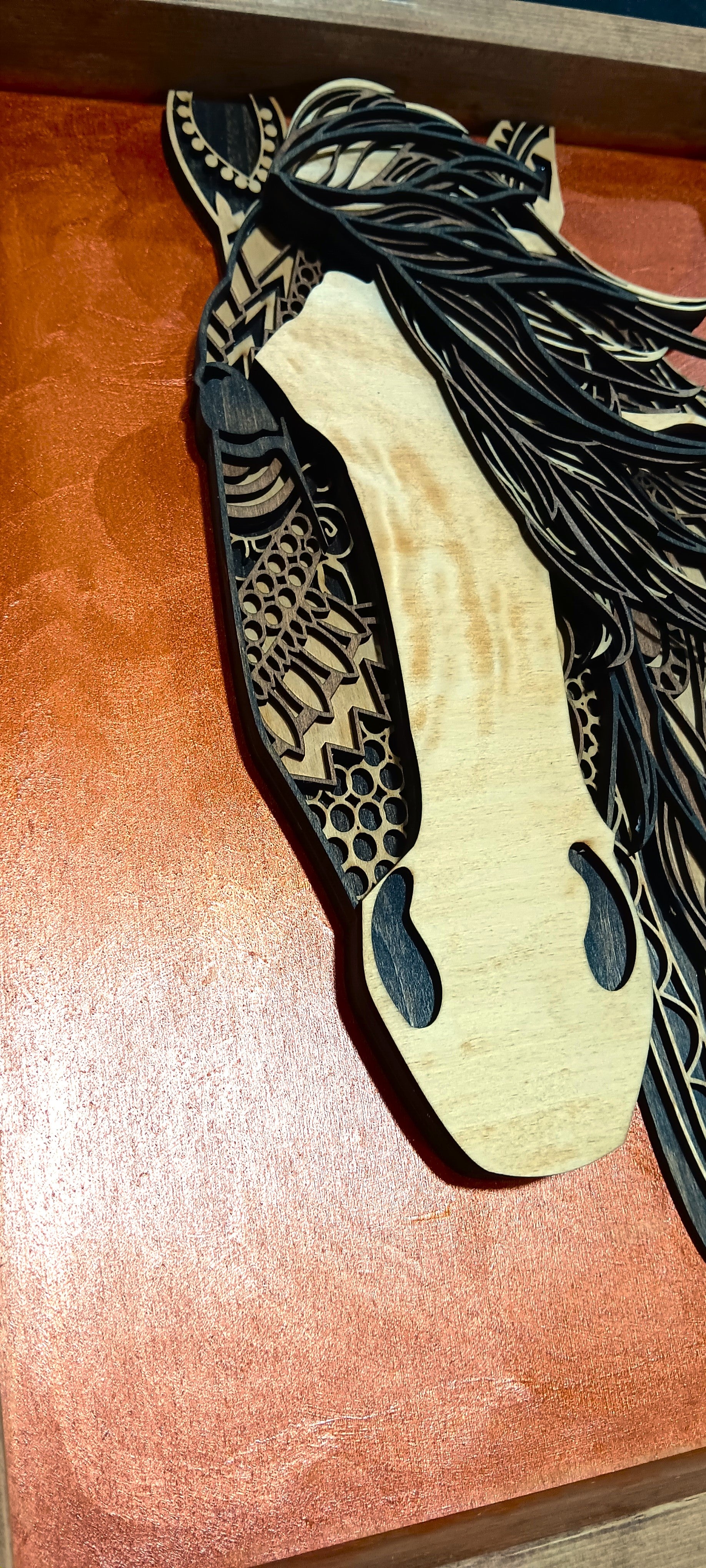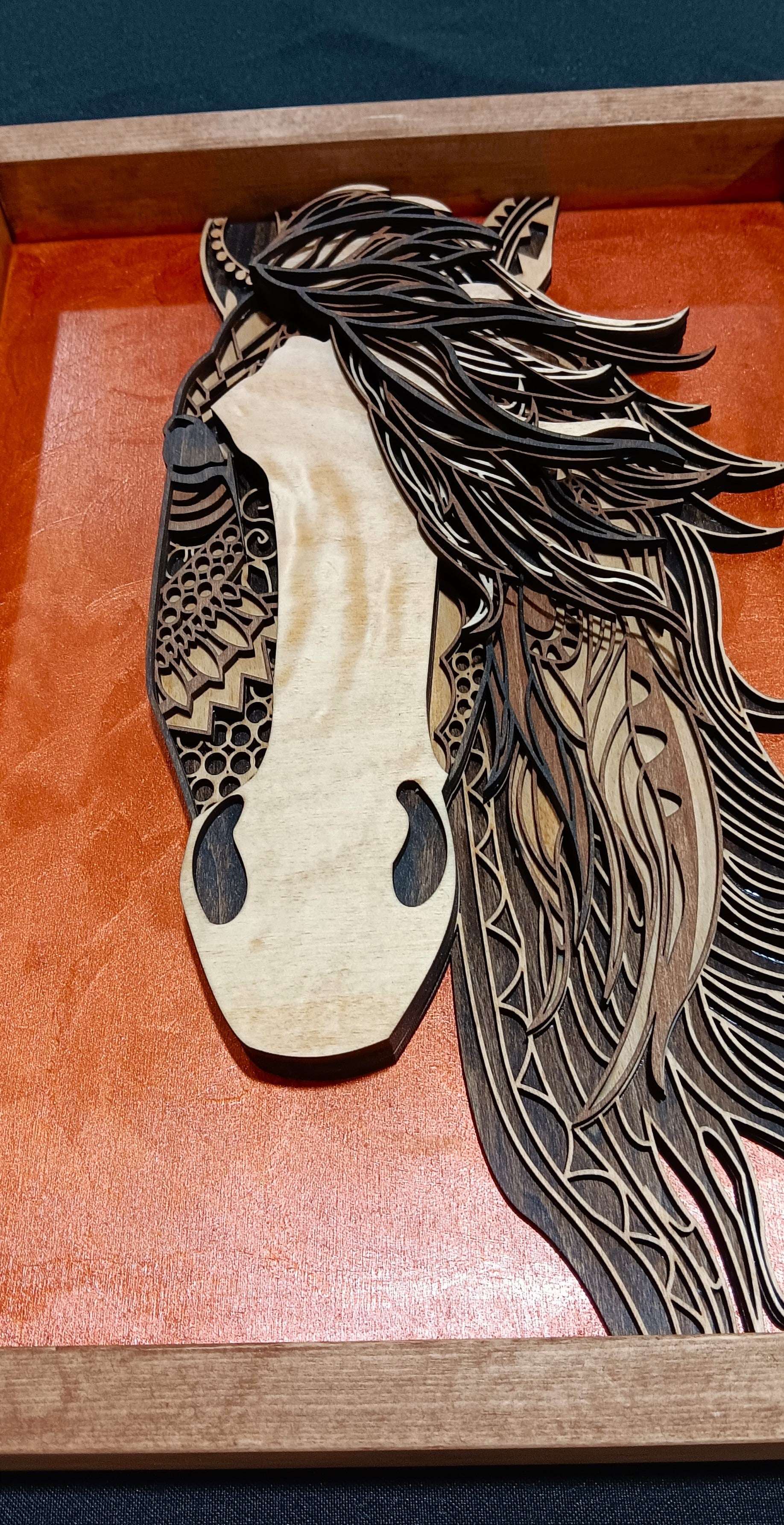The beautiful horse has 7 layers!! Each one meticulously layered on top of the last. The layers are stained in a stagger of Dark Walnut, Early American and Spring Oak.
