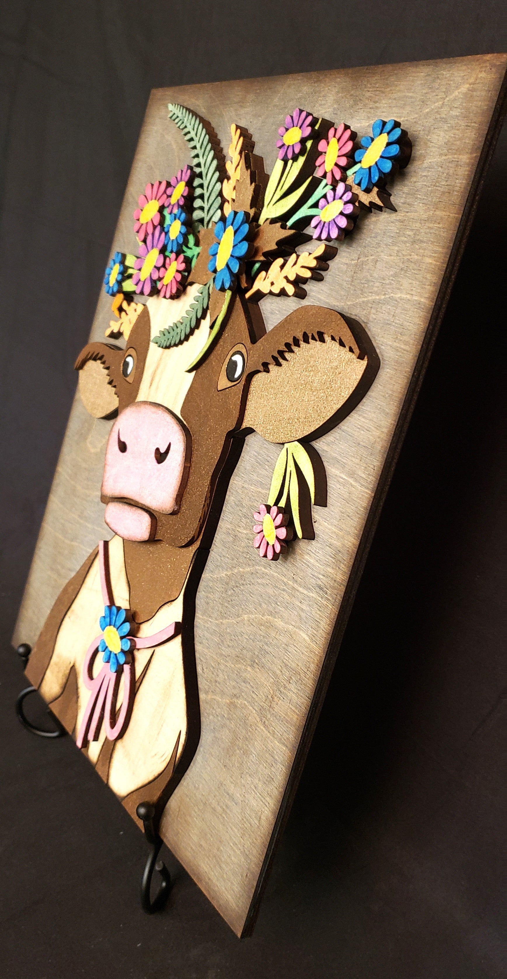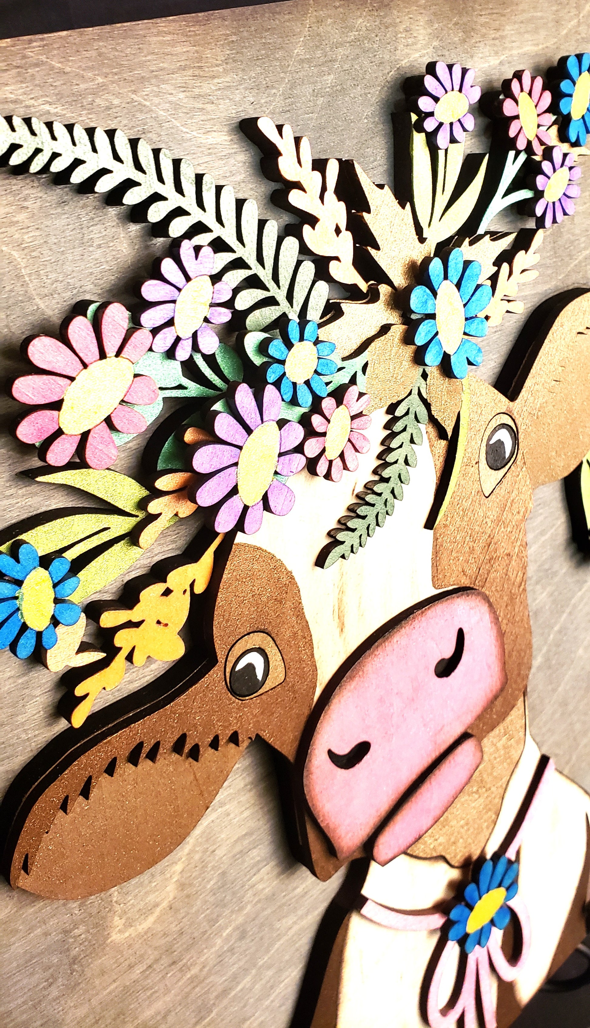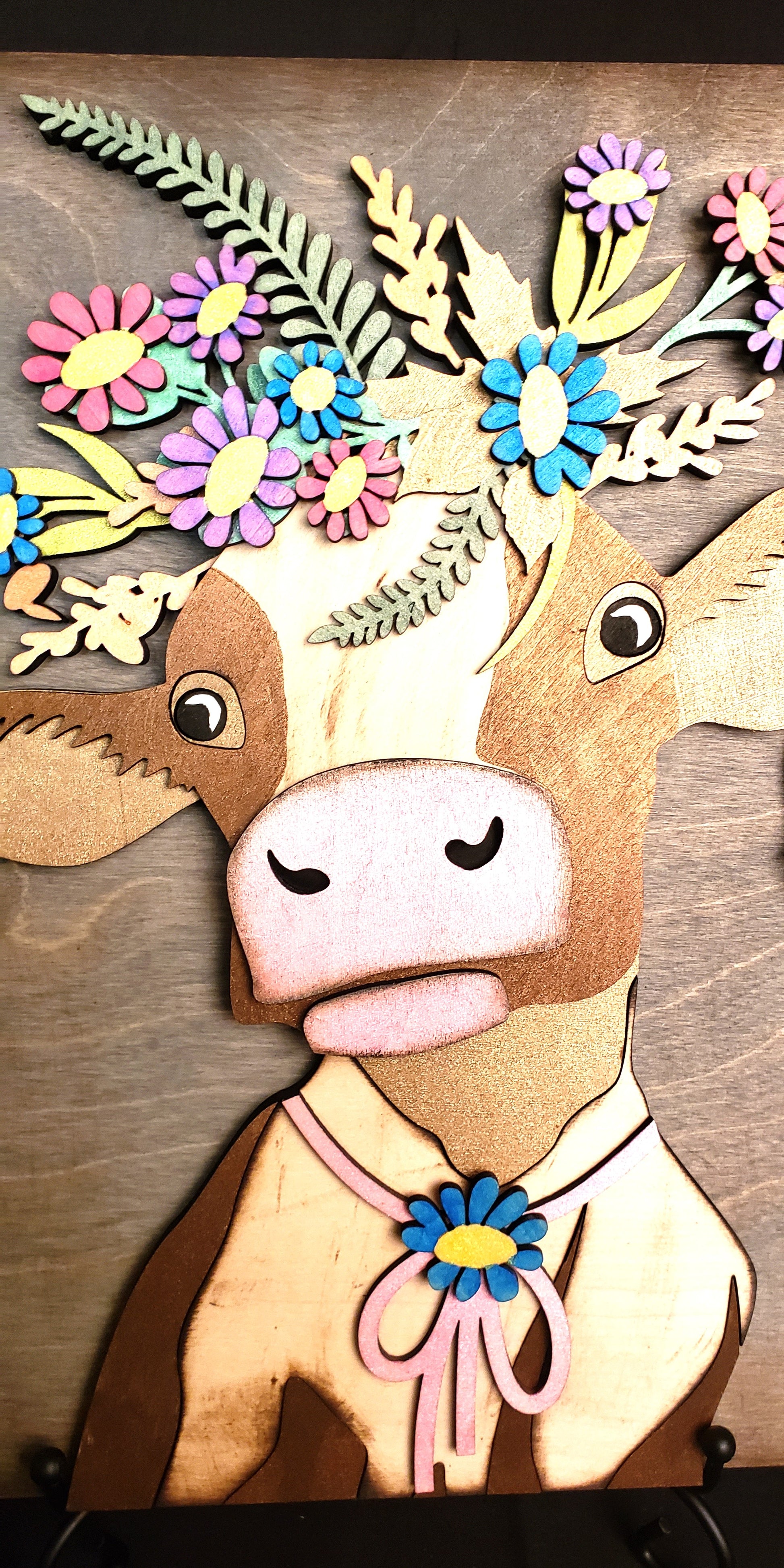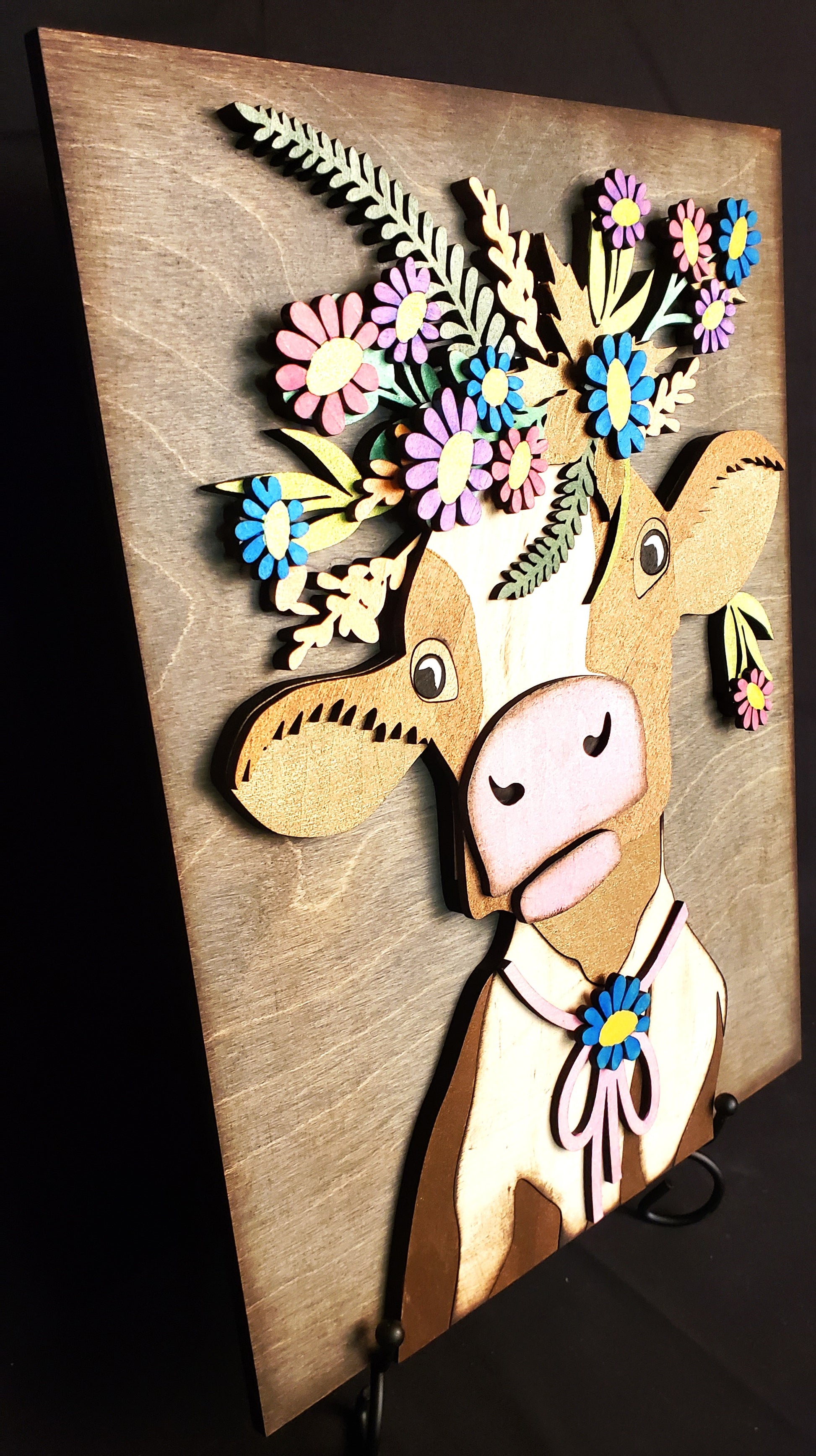 Add a touch of charm to your home decor with this exquisite Jersey Cow Hanging Decor. This laser-cut wooden piece features an adorable Jersey Cow adorned with a thirteen flower headpiece, which is hand-painted to perfection.