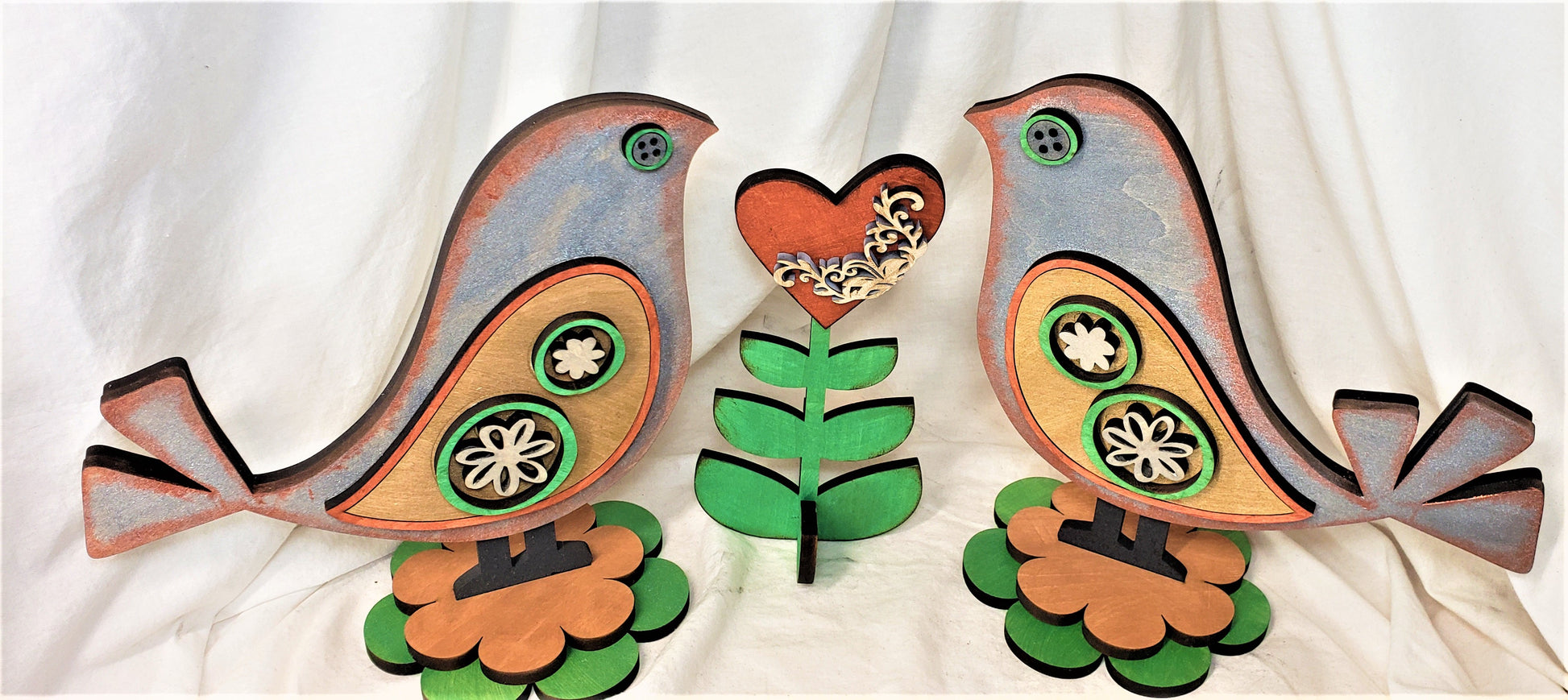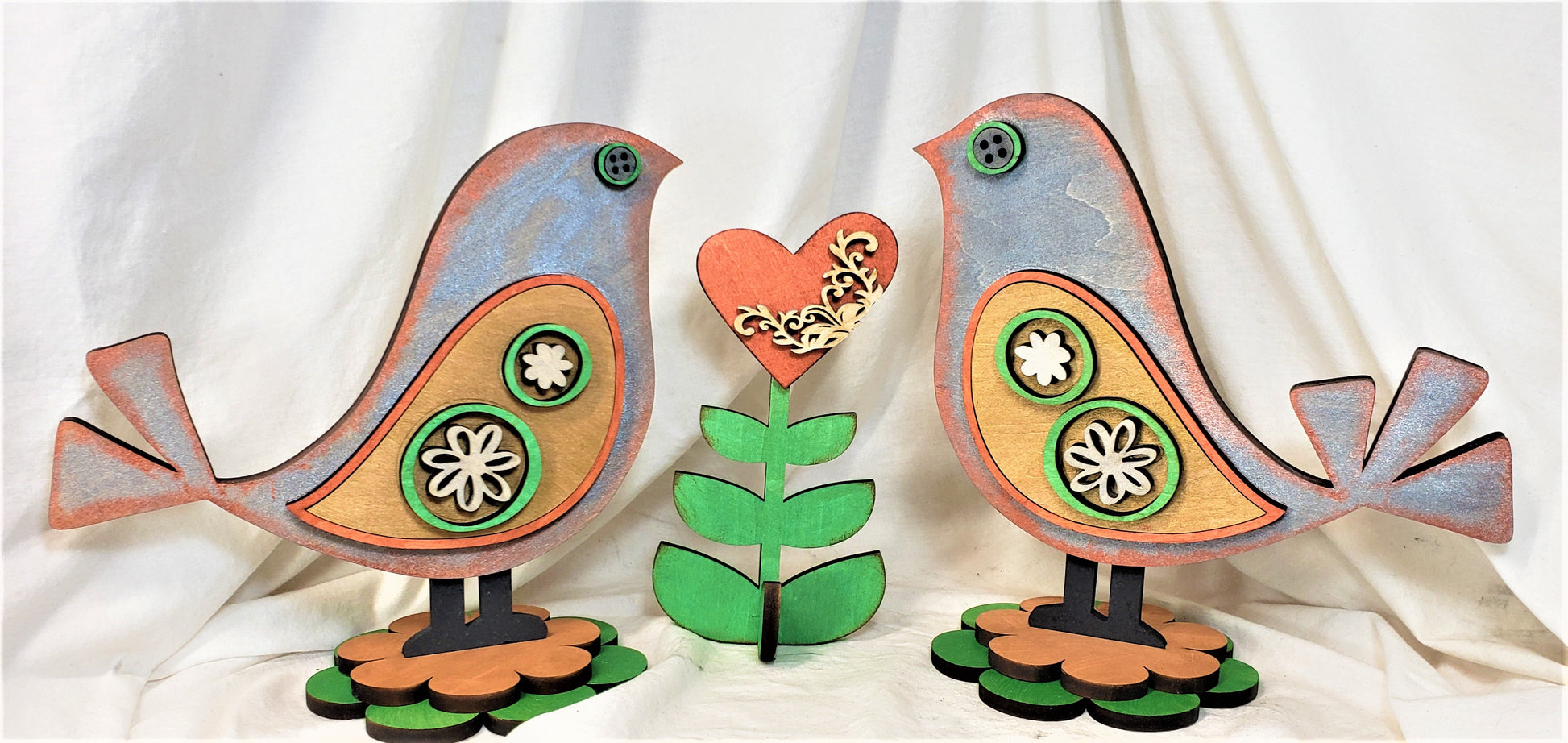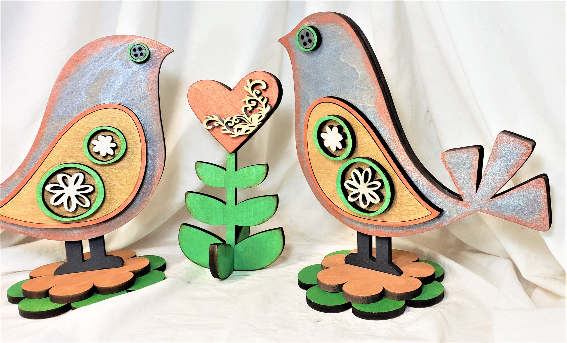 Each bird has its own two tier stand and the flower heart stands by itself as well.
