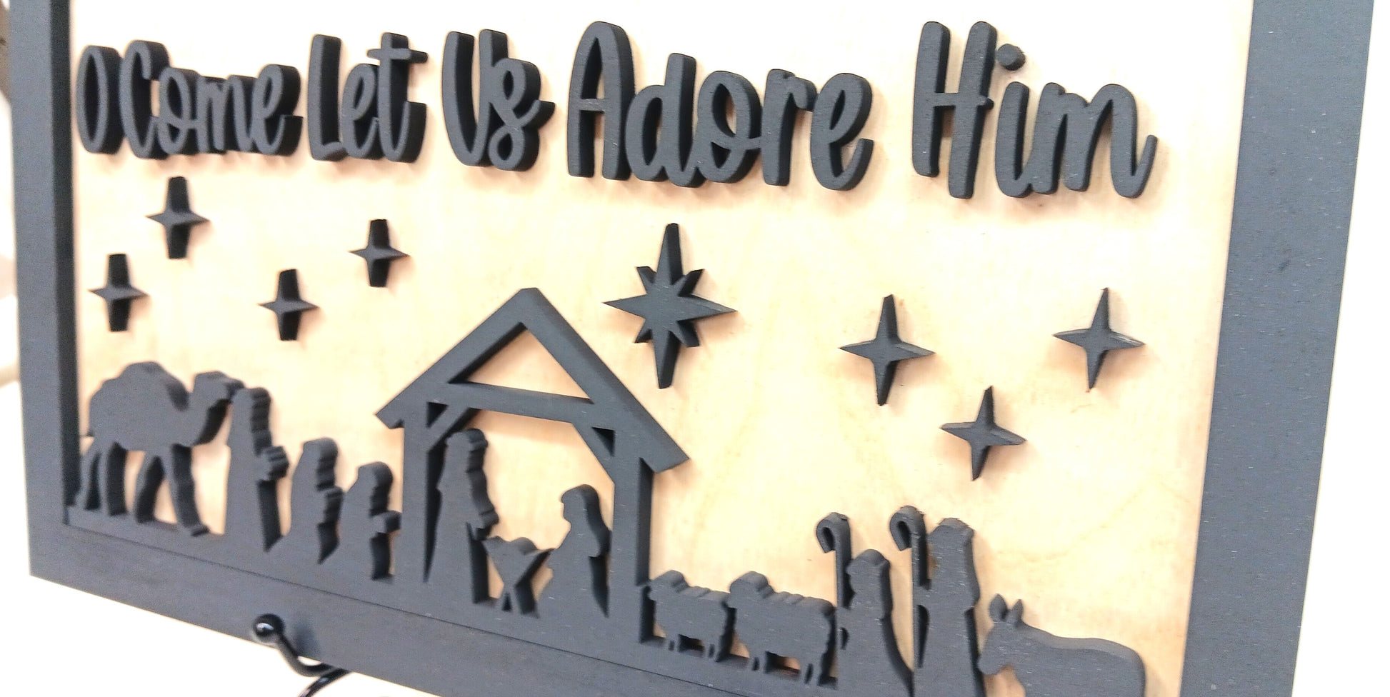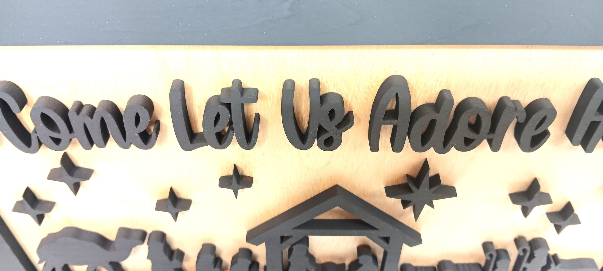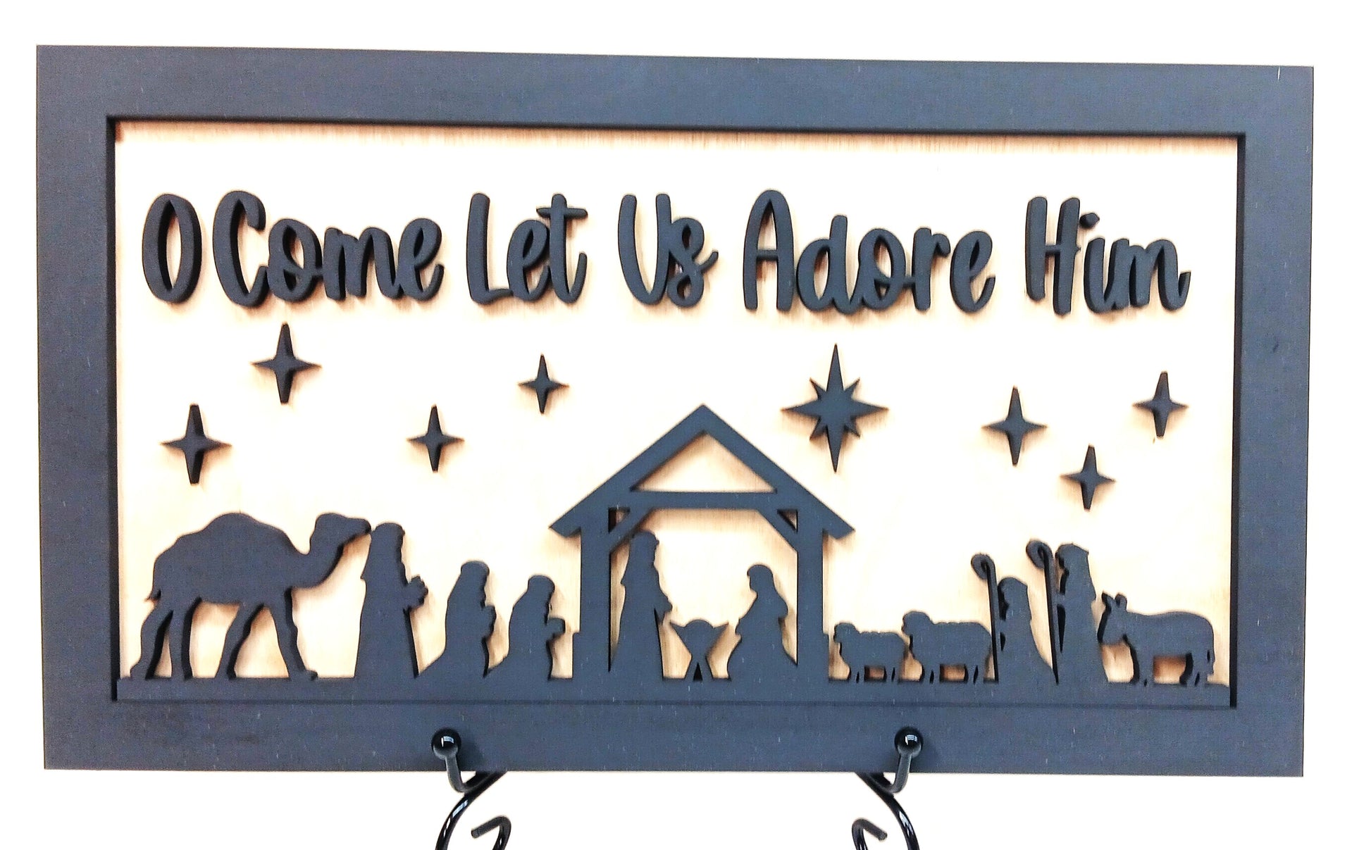 The nativity scene, stars, and lettering are painted in chalk black, giving it a silhouette look against the back piece.
