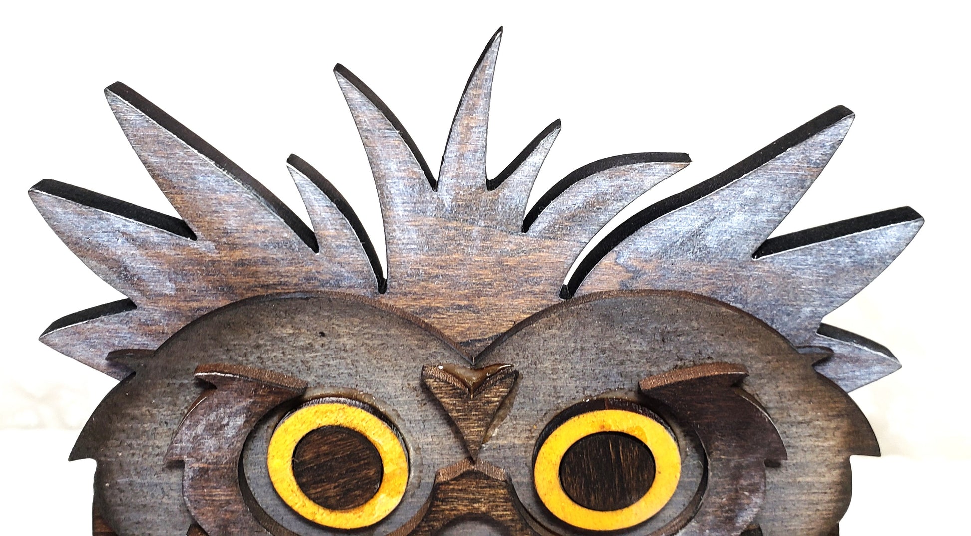 His main body and his wings are a dark Walnut color and his tummy and eye fluff are a medium grey.