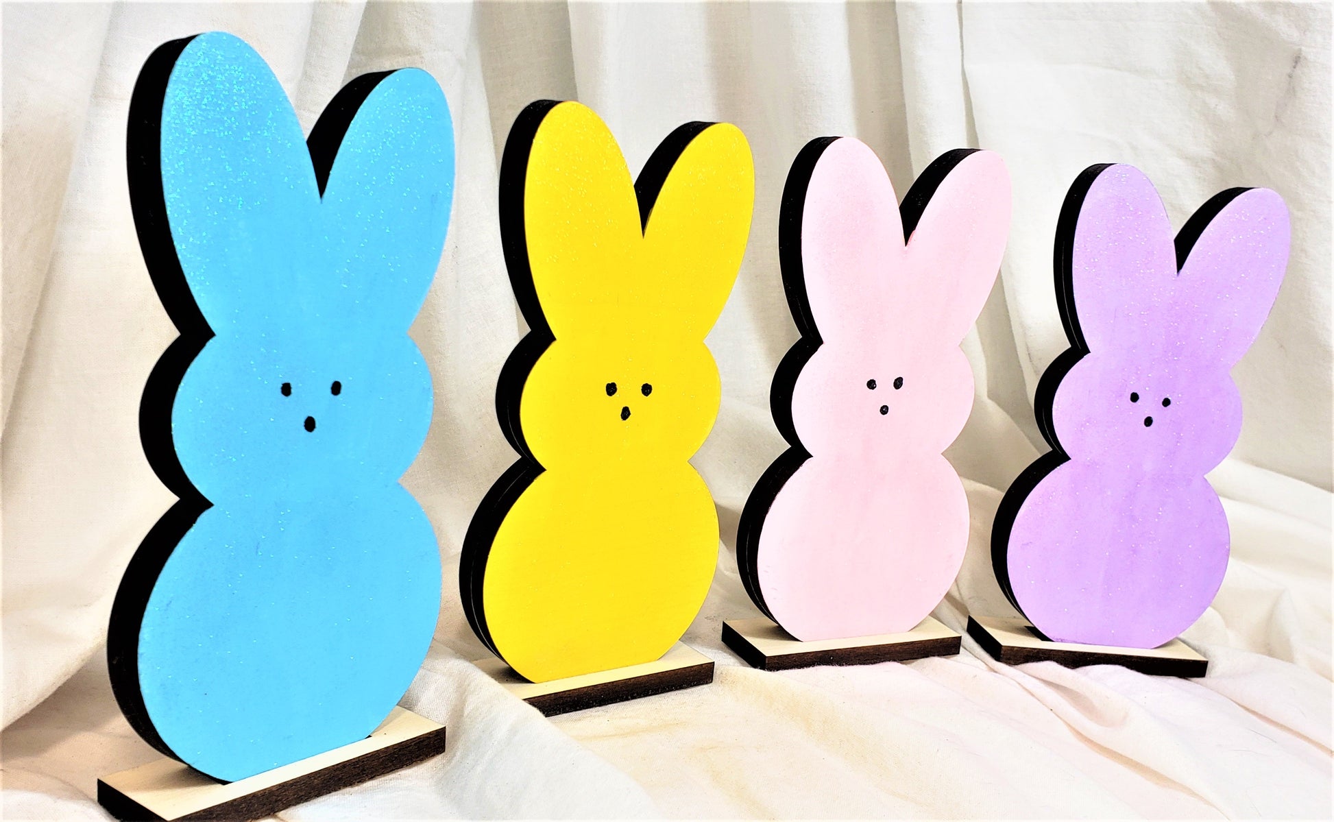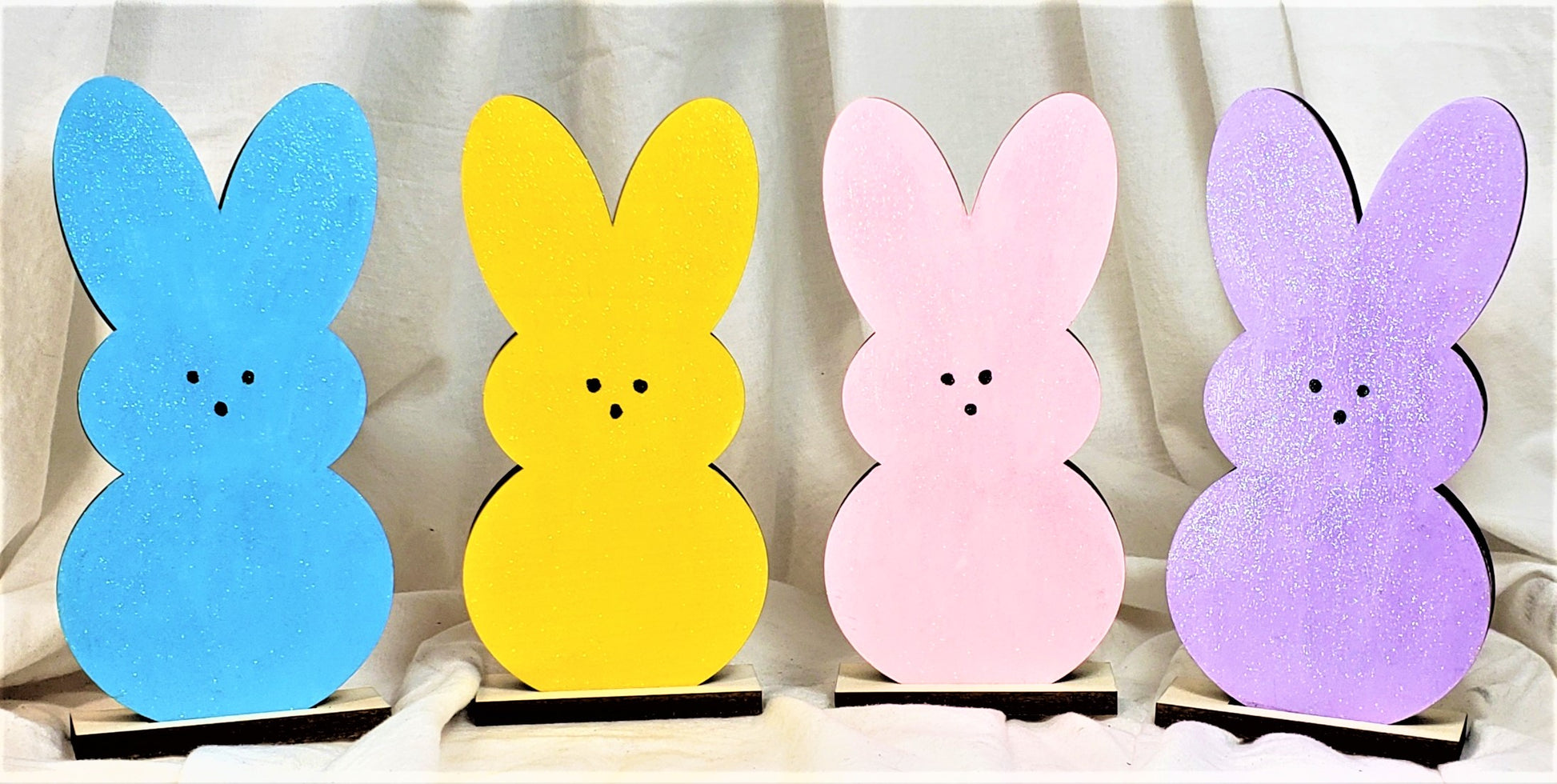 I hand paint each piece with acrylic paints and then give them a coating of glitter paint to look like the sugar coating on Peeps. Each piece is then given a polyacrylic coating to protect its color for years and years to come!