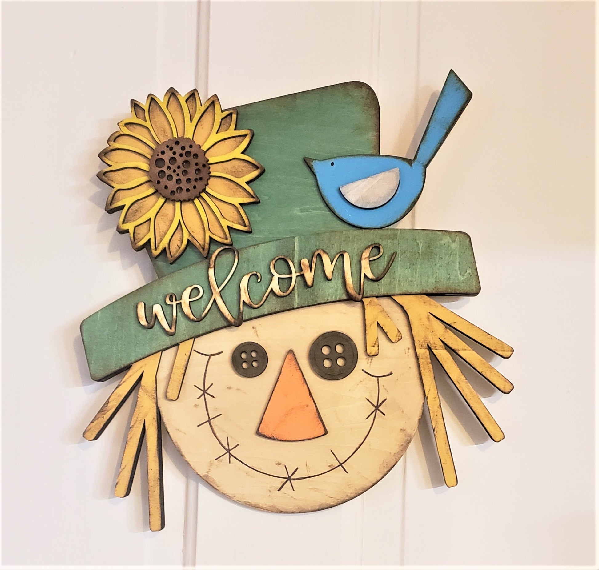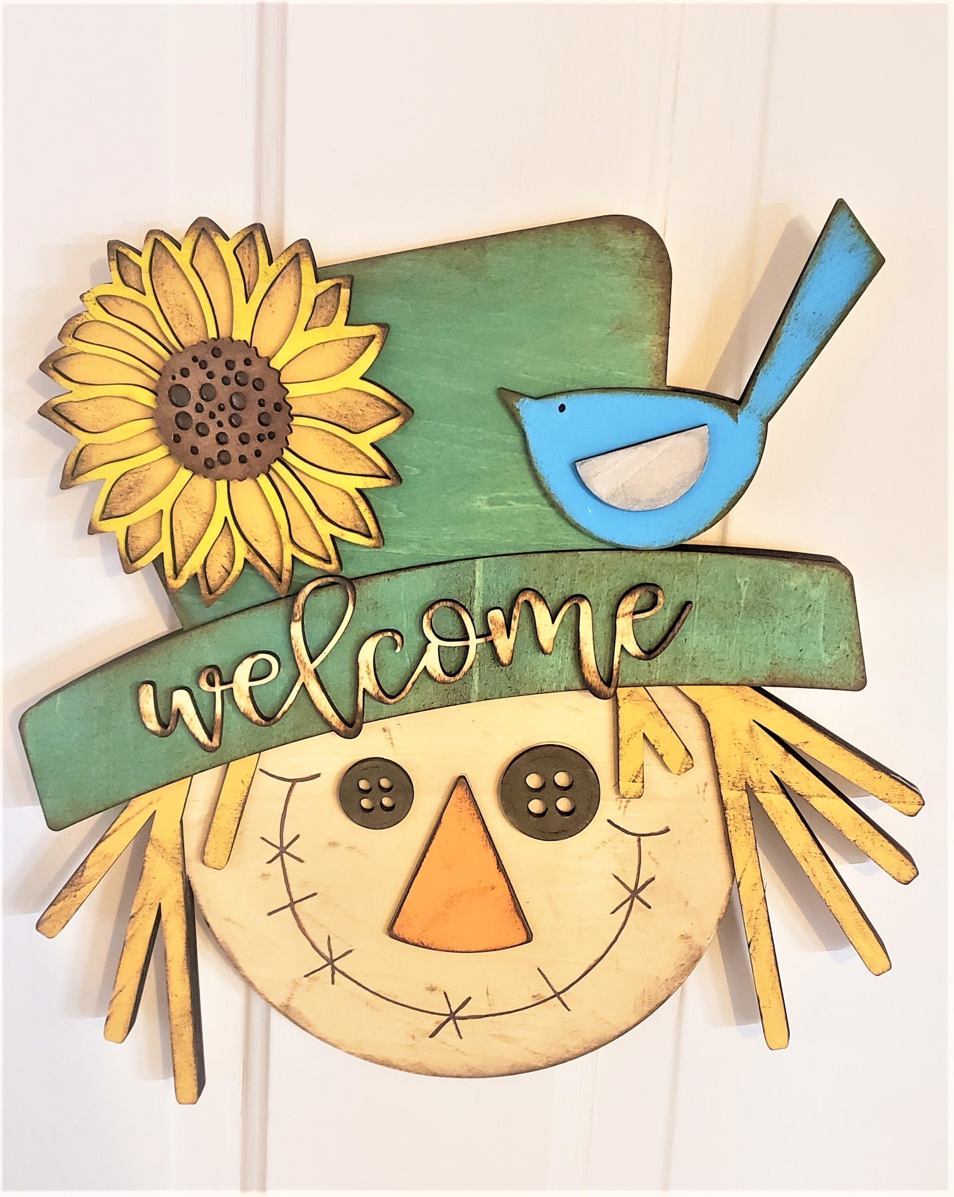 This cute Scarecrow Wall Hanger is ready for fall and ready to welcome you and your friends home!!
