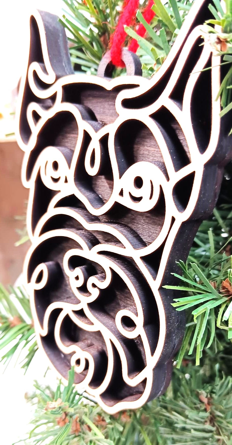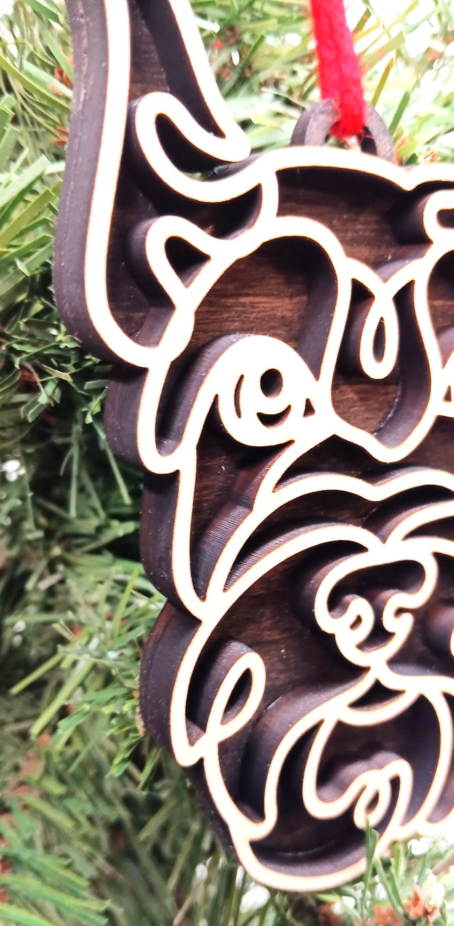 This wooden ornament is two layers of premium woods. The back layer has a unique Aged Barrel stain. The top layer is made from hard maple, and it has a polyacrylic coating.
