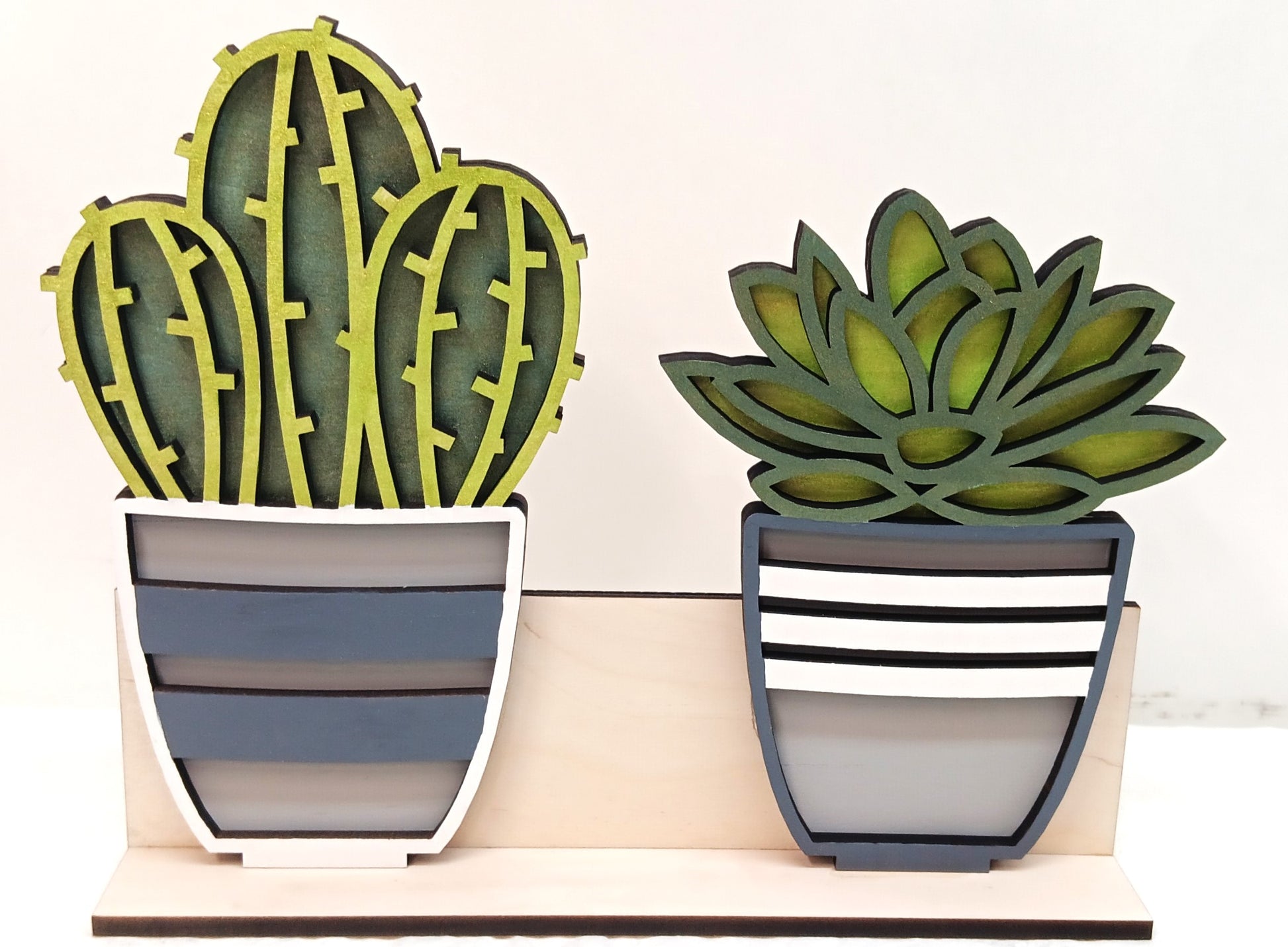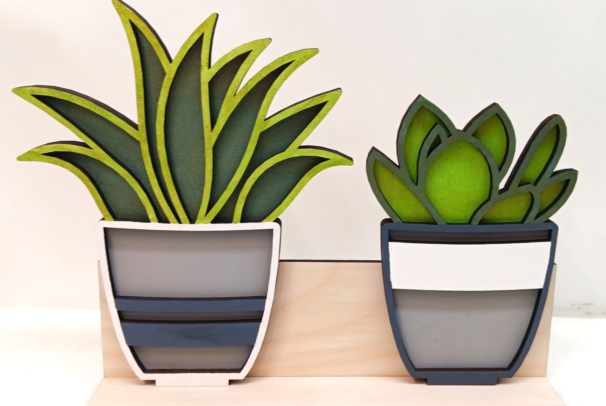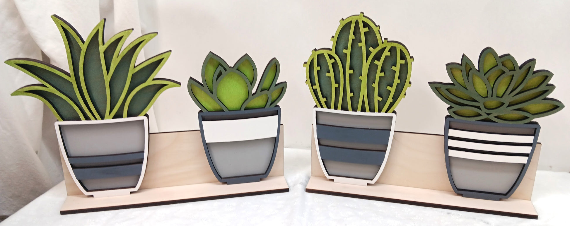 These four adorable plants are laser cut on our laser using only Basswood! They stand a whopping 10 inches tall and are 13 & 14 inches wide!