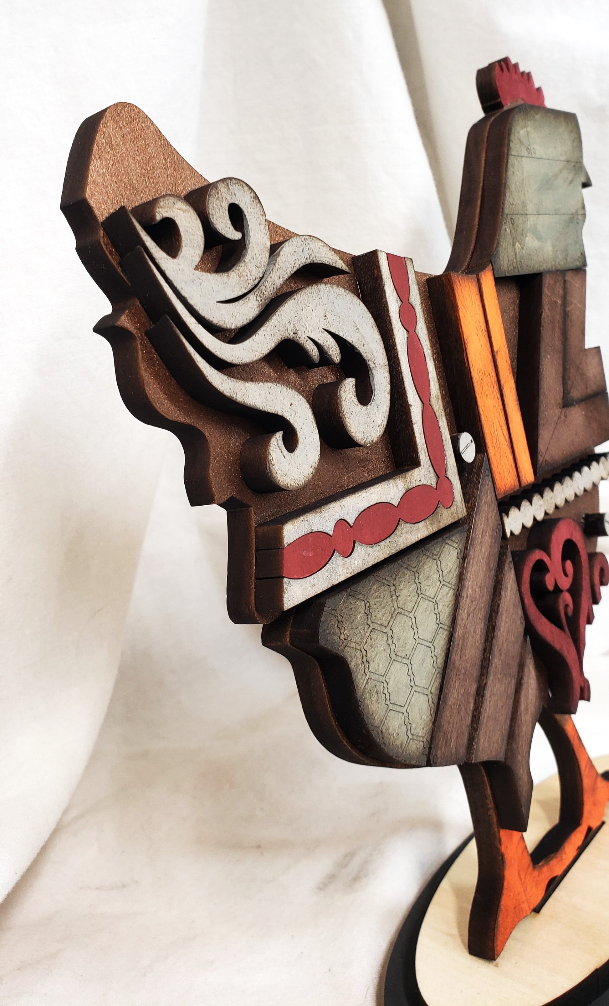 I cut him on our laser and then hand paint each piece in vintage browns, greys, burgundies, and yellows. Finally, he gets a polyacrylic coating to protect his beauty.